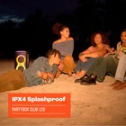 Powerful JBL Pro Sound: Rock out to powerful JBL Pro Sound that delivers clear, dynamic sounds and deeper bass even at top volume. Futuristic lightshow: Pair that amazing sound with a thrilling futuristic lightshow featuring starry lights, cool light trails, and strobe light effects, all synced to your beat. Up to 12 hours of play time: Dance through the night with up to 12 hours on a single charge. Just warming up? Swap out the replaceable battery* and keep going. 10 min fast charge gets you an extra 80 min of playtime. *Replaceable battery sold separately Foldable handle: A folding handle makes the PartyBox Club 120 easy to take with you anywhere. The speaker's ergonomic body is designed with even weight distribution so it's easy to carry. Splash proof: Whether you're partying with friends in the park or by the seaside, the JBL PartyBox Club 120 is IPX4 splashproof, means a little rain won't stop the fun. Multi-speaker connection by Auracast: Want even more roaring Original JBL Pro Sound? Stereo pair two speakers for a wider sound stage. For your biggest events, multiple JBL Auracast-enabled PartyBoxes can be connected wirelessly using Auracast. Dual Mic & Guitar Inputs: Bring live talent into the mix. It's easy to sing and play along using the guitar and dual mic inputs. With karaoke EQ tuning and the built-in lightshow, everybody's gonna sound—and look—like a superstar. The JBL PartyBox Club 120 turns any space to party, and vibe. Powerful JBL Pro Sound fills the air while an entrancing lightshow of starry lights, cool light trails, and strobe effects syncs to your beat. Instantly pair any Bluetooth device and stream your favorite party playlist, or use the mic and guitar inputs to share your own sound. Either way, you can steer the party's flow with fun interactive party effects using the JBL PartyBox app. A folding ergonomic handle makes the PartyBox Club 120 easy to take with you anywhere, and the splash-proof construction means it won't be troubled by a little rain. It delivers up to 12 hours of playtime—and if the party's still flowing by then, just swap out the replaceable battery and keep the music and lights going strong. For an even bigger time, stereo pair two JBL PartyBox Club 120s for a wider soundstage, or use the JBL PartyBox app to connect multiple JBL Auracast-enabled speakers wirelessly. Roll up to the party with the JBL PartyBox Club 120.