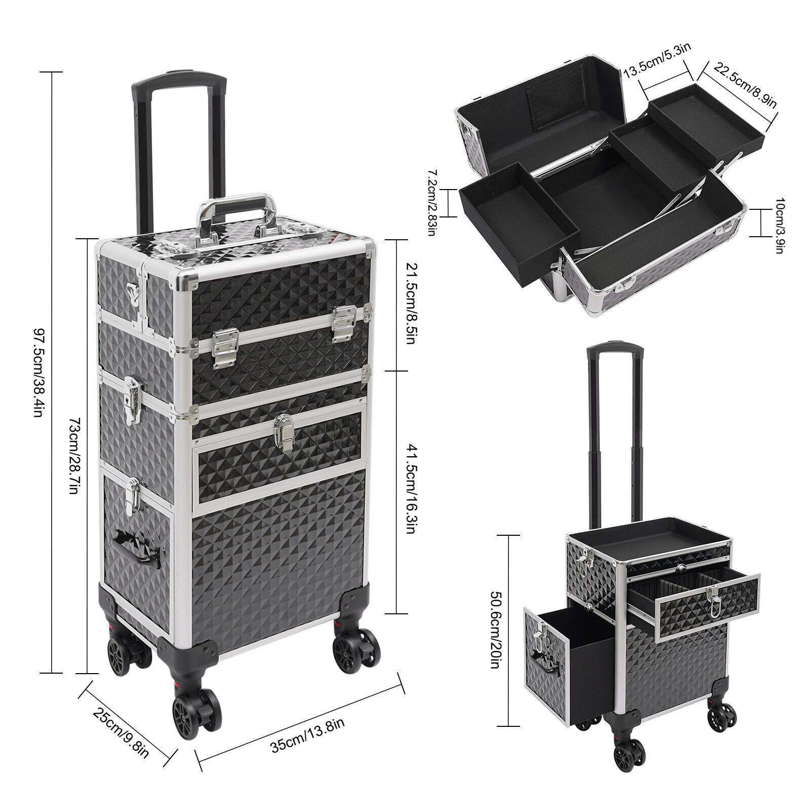 Rolling Makeup Case Travel Cosmetic Storage Box/Moving Salon Beauty Trolley Cart Professional Rolling Makeup Train Case, Multi-functional Cosmetic Trolley, Large Storage Traveling Cart Trunk Description Are you still worried about too many cosmetics and inconvenient to carry? Then take a look at our rolling makeup case. It is mainly made of premium materials and features large capacity storage with multiple tiers, fully meeting needs. It will become an ideal purchase for every beauty girl, make-up artist, and hair stylist. Key Features Sturdy and Durable: It is made of high-quality ABS and aluminum alloy with an oxidation process , making it waterproof, anti-scratch , and resistant to wear and corrosion , ensuring its long service life. Large Capacity: The top compartment consists of a tray and 2 sliding drawers. Meanwhile, the top tier can be used separately as a small makeup case with an adjustable shoulder strap for easy carrying. The second tier is equipped with removable flaps to keep your cosmetics organized. There is also a large storage space at the bottom for hair tools, cosmetics and a nail lamp. High Load Capacity: The rectangular structure and high quality materials ensure that it can hold items weighing up to 110 lbs , so you can rest assured that your daily toiletries will fit inside! Thoughtful Design: An adjustable pull rod suits your height with less sway and the four universal wheels with brakes on the bottom help you move this product smoothly and conveniently. High Safety: The latches, built-in lock cores, and equipped keys allow you to lock and unlock the product for added security when you are out. Portable : This product can be handheld, cross - body, pushed and pulled, making it c onvenient to Carry when traveling . Easy to Clean: Thanks to its smooth surface and simple construction, you can clean it with a wet rag. Ideal Gift: Its smooth and simple lines and stylish look present a young and modern style, together with its large capacity, making it an excellent gift for various holidays to your friends and family. Protective Package: We have packaged this product in foam and air bubble bags designed to minimize damage to the product during shipping. Details Ergonomic Handle: It provides a comfortable grip and can reduce hand pressure while allowing for convenient carrying. Shoulder Strap: The adjustable shoulder strap can be convenient for you to carry the product for use on the go. Application It's ideal for professional make-up artists, hair stylists, beauticians, nail tech students, or anyone who owns a lot of make-up. It can be used to store cosmetics and beauty tools, such as foundation powder, lipstick, hair wax, eye shadow, curling iron, mascara, eyebrow pencil, nail polish, and comb. Specification Color: Silver and Black Process: Oxidation Material: ABS and Aluminum Alloy Style: Modern Shape: Rectangular Assembly Required: Yes Mounting Type: Floorstanding Load Capacity: 50kg/110lbs Total Height of Box: 73cm/28.7in Product Size: 35*25*97.5cm/13.8*9.8*38.4in Package Size: 80*38*28cm/31.5*14.96*11.02in Gross Weight: 9kg/19.84 lbs Net Weight: 8kg/17.64 lbs Package Included 1* Rolling Makeup Case 1* Shoulder Strap 4* Keys 4* Wheels Notes Please note that cosmetics are not included. Please use this product within its carrying capacity. It's normal for the tie rod to wobble a little bit as it needs clearance to move back and forth better. If it is too tight, it will harm the tie rod instead. Please make sure you don't mind before purchasing. The service wear of the case is a normal phenomenon. In the process of daily use, please try to avoid excessive impact and drop to extend the lifespan of the product. Please clear the wheels in time to maintain smooth movement. Please allow the slight color difference caused by the shooting light and 1-3cm error due to manual measurement, and make sure you do not mind before ordering. Payment Delivery details Terms of sales About us Contact us Payment We accept ebay payment 。 Fees such as import duties, taxes are not included in the item price or shipping costs. These charges are the buyer's responsibility. Delivery details Shipping: 2-9 working days to: USA Terms of sales We maintain high standards of excellence and strive for hundred percent customer satisfaction. Feedback is very important to us. We hope that you contact us immediately before you give neutral or negative feedback, so that we can address your concerns. It is impossible to address issues if we do not know about them! About us Your satis faction is our ultimate goal. We work hard to earn your trust and future business. Our certified technicians have tested each item before shipping. The unit comes with 1 year limited warranty on all manufacturing defects. a) If you receive a defective item, you may return it or ask for a discount. Please contact us within 14 days after you receive the package. b) What you returned must be intact and in its original packaging as re? u. Customer is responsible for shipping costs of the returned item. c) We will cover the cost of shipping back t with the shipping rate indicated in the registration page. We will send you a new unit or refund the full payment you paid. Thank you. Contact us Business Hour Business Hour: Monday To Friday: 8:30 AM to 5:00 PM (Beijing China time) Due to time zones, our reply to your questions may not be immediately. But within above working time, we will reply your email within 24 hours. If it's non-workdays, please kindly be patient and wait till Monday. Please contact us with ebay message. Please feel free to contact us if you have any questions. Monday To Friday: 8:30 AM to 5:00 PM (Beijing China time) Due to time zones, our reply to your questions may not be immediately. But within above working time, we will reply your email within 24 hours. If it's non-workdays, please kindly be patient and wait till Monday. Please contact us with ebay message. Please feel free to contact us if you have any qu