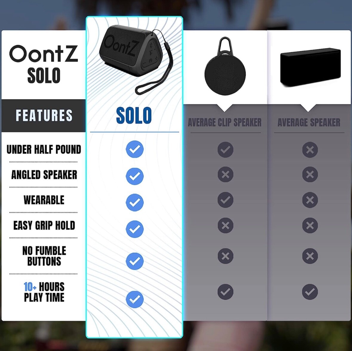 Surprisingly Loud Volume - The OontZ solo is Designed and Engineered by Cambridge Sound Works in the USA to deliver full range of sound with 5 watts of power from a custom neodymium driver; our proprietary passive bass radiator design delivers surprising bass output from such a compact design ....... the perfect travel speaker Incredible 100 Foot Bluetooth Range - Play up to 100 feet away from your device; our advanced antenna design with Bluetooth 5 provides fast connection and incredible wireless Bluetooth range of up to 100 unobstructed feet from your device; connects easily with the Echo Dot, Echo Dot 3rd Gen, Echo, Echo Plus, iPhone 6, iPhone 7, iPhone 8, iPhone X, iPad, Samsung Galaxy 8, Samsung Galaxy 9, Samsung Note, Smartphone, Cellphone, Laptop, computer, Mac, and all other Bluetooth devices Water resistant IPX5 - Splash proof, rainproof, Dustproof, outdoor travel speaker, perfect for the beach, poolside, golf cart; IPX5 rating speaker can resist gentle water spray & splash but cannot be partially or fully submerged Stylish Super Lightweight - Under 8 ounces, super compact 3.9 inches long and 2.8 inches tall ounces, built in rechargeable battery for up to 10 hours of playtime at 2/3 volume Perfect on the Go Travel Speaker - BUILT-IN Microphone for personal handsfree speakerphone calls from a Cellphone or iPhone; AUX IN Jack connect from TVs and non-Bluetooth devices with a 3.5mm Line-In cable; INCLUDES Micro-USB charging cable and Lanyard