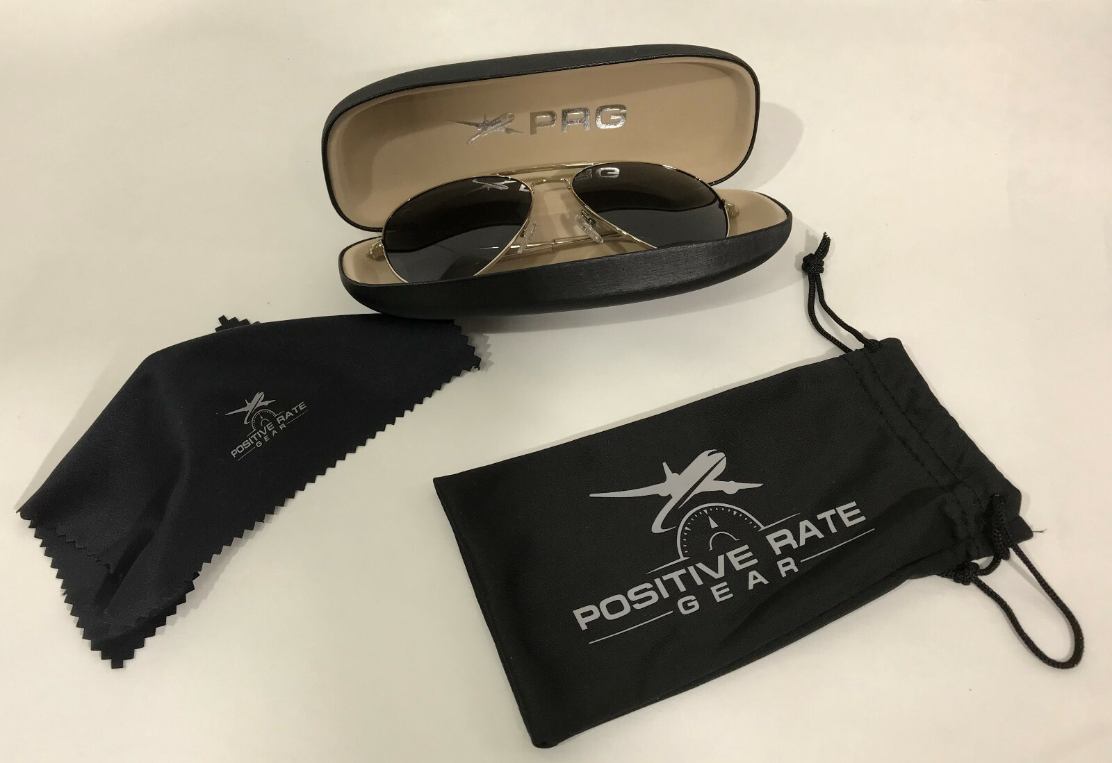 Rose Gold, Silver or Black Framed Aviator Sunglasses Positive Rate Gear Sunglasses are designed for Aviators. Aviator Sunglasses not only evoke a certain style, but are also a safety item. Certain characteristics are important for eye wear to assist in the performance of your duties and provide long term comfort. The Federal Aviation Administration deemed this personal equipment item critical enough to publish an advisory type brochure on the subject. Positive Rate sunglasses are designed to fully comply with these recommendations. The lens frames are made from stainless steel. The ear pieces are a titanium alloy. High quality metals were selected to ensure that your eye wear will withstand long duty days. Wire thin shape to feel light and comfortable while you are wearing them for the long haul and slender enough not to interfere with headsets. For storage, the frames fold slender to fit in a shirt pocket or store in a protective clothe bag and a hard case (both are included with purchase). The poly carbonate lens are Neutral Gray to provide muted but clearly transmitted color and provides 100% UV Protection without interfering with the visual picture. FAA recommendations are 15 to 30% light transmittance to reduce glare but not prevent recognition of visual cues. These lens provide 20% transmittance. The lens are Not Polarized. Polarized lenses can interfere with color recognition causing data on electronic displays to be unreadable at certain angles, multi-layered windshields will appear with a distorted rainbow of colors and increase potential to not see light reflected off of approaching traffic. For these reasons, Positive Rate Gear does not produce Polarized lenses. Select your preferred color of frames from Rose Gold, Silver or Black. Free Shipping!