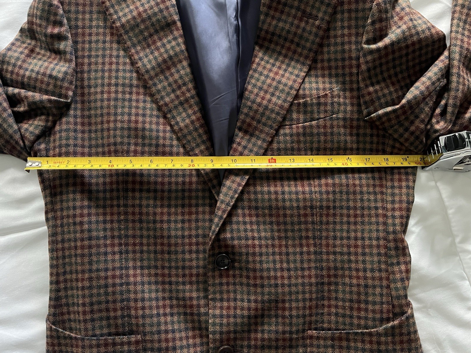 Originally $650 euros The Poszetka Sportcoat Blazer is a stylish and versatile piece for men, featuring a brown and red check pattern. This regular-length blazer is perfect for casual or business occasions, with a four-button sleeve button style and a flat front design. The brand Poszetka ensures quality and attention to detail in this classic sportcoat.