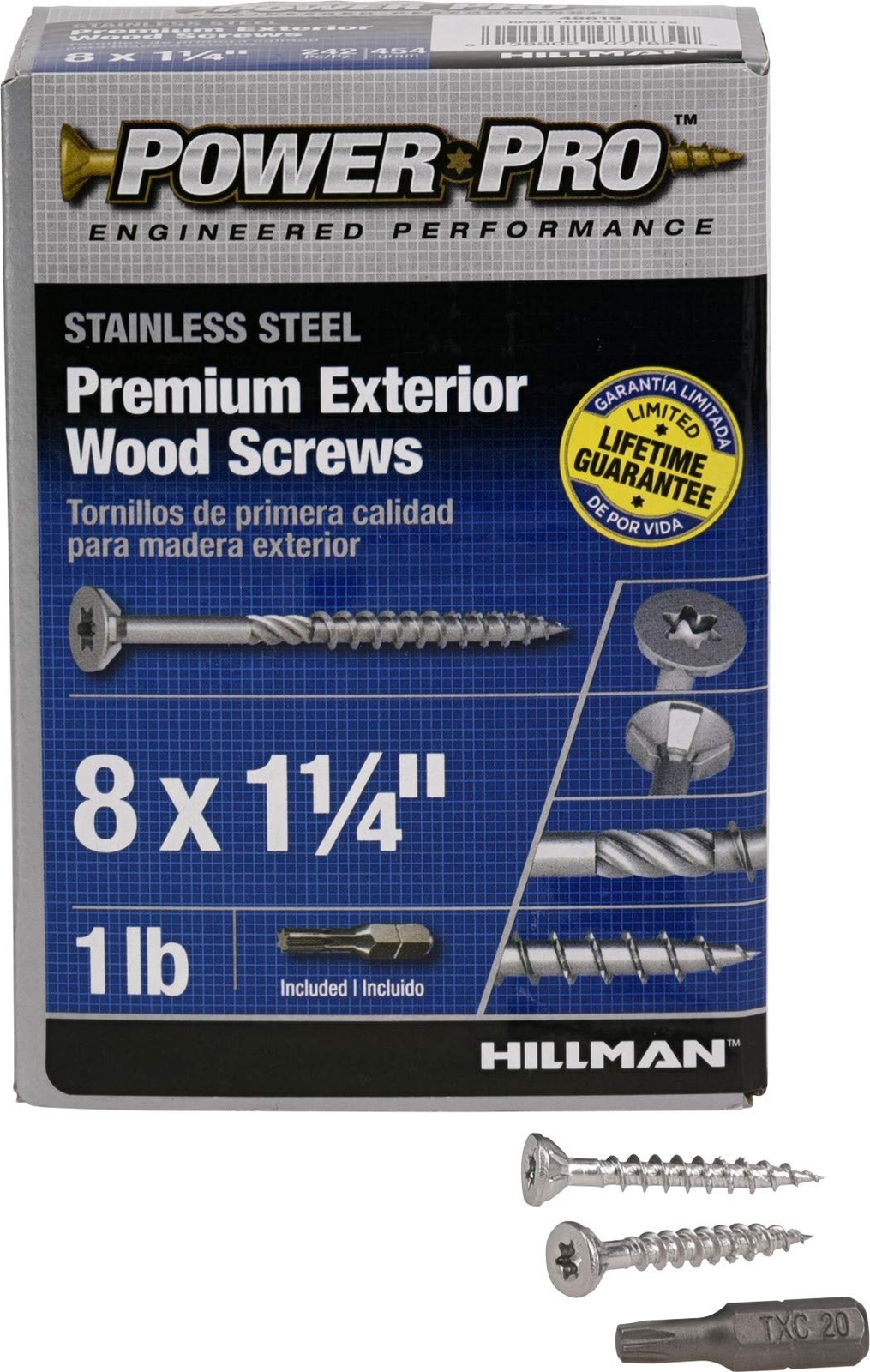 48619 Exterior Wood Screws, #8 x 1-1/4", Epoxy Coated, Torx/Star Drive Included, Coarse Thread, Decking Screws, Outdoor Rust Resistant, Stainless Steel, 242pcs Engineered for the outdoors: Ideal for decking and any outdoor wood project Best-in-Class Corrosion Protection: High marine grade 305 Stainless Steel Coating offers superior rust and corrosion protection Installs Quickly: 20 percent faster engagement with material compared to standard wood screws No Splitting: 75 percent less wood splitting than standard wood screws 1lb Box contains approximately 242 pieces; this assortment is sold by weight and actual piece count may vary. Specifications: 242 pieces, #8 x 1-1/4" Wood Screws, T20 Star/Torx Drive Bit Included. Limited : Backed by Hillman's unparalleled customer service that goes above and beyond to ensure your satisfaction. Parts carry a limited against rust & corrosion Shipping We offer FREE shipping on all orders! We ship within Three business days of payment, usually sooner. We use a selection of shipping services such as UPS, FedEx, USPS etc. We only ship to the lower 48 states, no APO/FPO addresses or PO Boxes allowed. Local pickups and combined shipping options are not provided at this time. Return You can return a product for up to 30 days from the date you purchased it. Any product you return must be in the same condition you received it and in the original packaging. Please keep the receipt. Payment We accept payment by any of the following methods: PayPal Please pay as soon as possible after winning an auction, as that will allow us to post your item to you sooner! Feedback Customer satisfaction is very important to us. If you have any problem with your order, please contact us and we will do our best to make you satisfied. Contact Us If you have any queries, please contact us via ebay. We usually respond within 24 hours on weekdays. Please visit our eBay store to check out other items for sale! Thank you for shopping at our store.