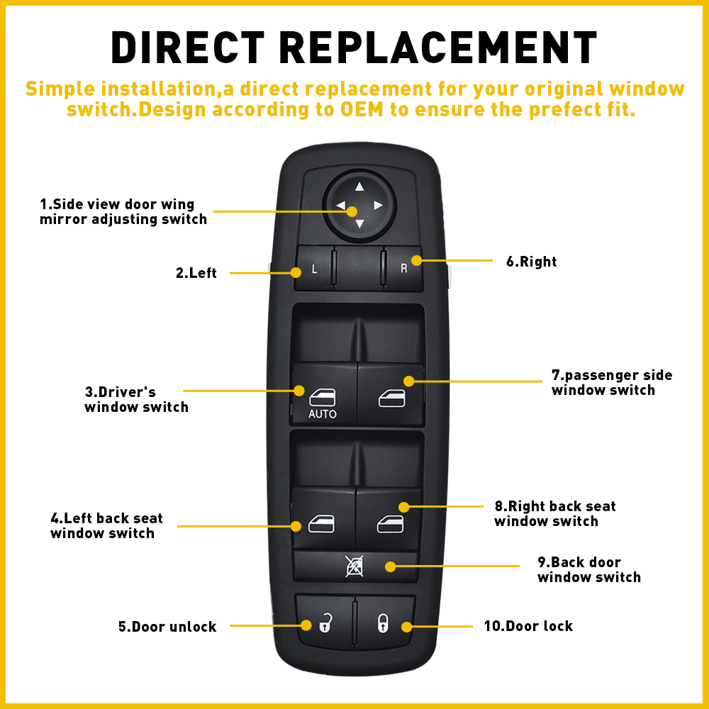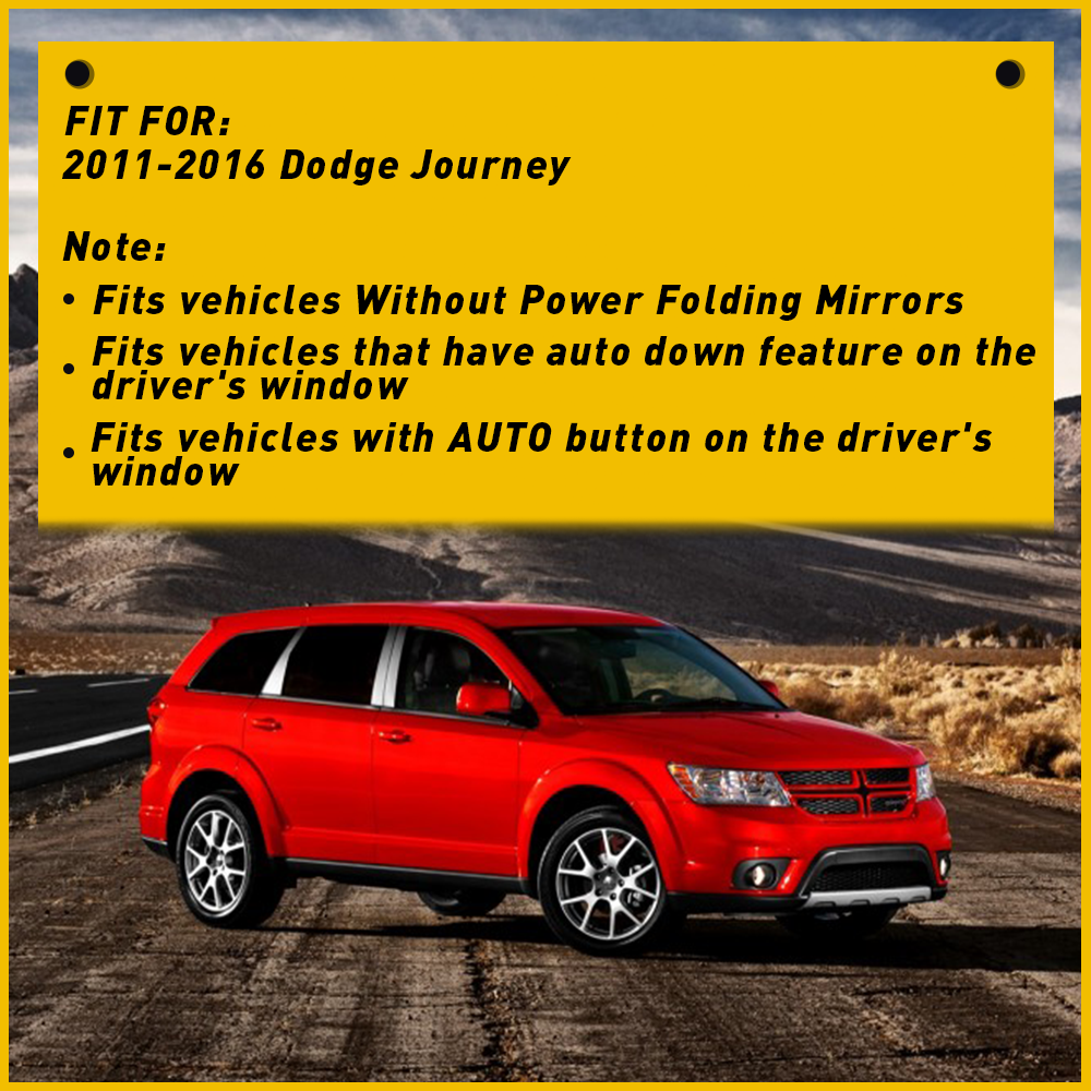 This power window switch is a fantastic direct replacement for Dodge Journey models! It matches the original perfectly in fit, function, and appearance. The improved stability and durability ensure it lasts longer than cheap alternatives. Installation is a breeze—no extra tools needed. It’s been rigorously tested for performance, so you can trust it works like OEM. Great value for a hassle-free fix!