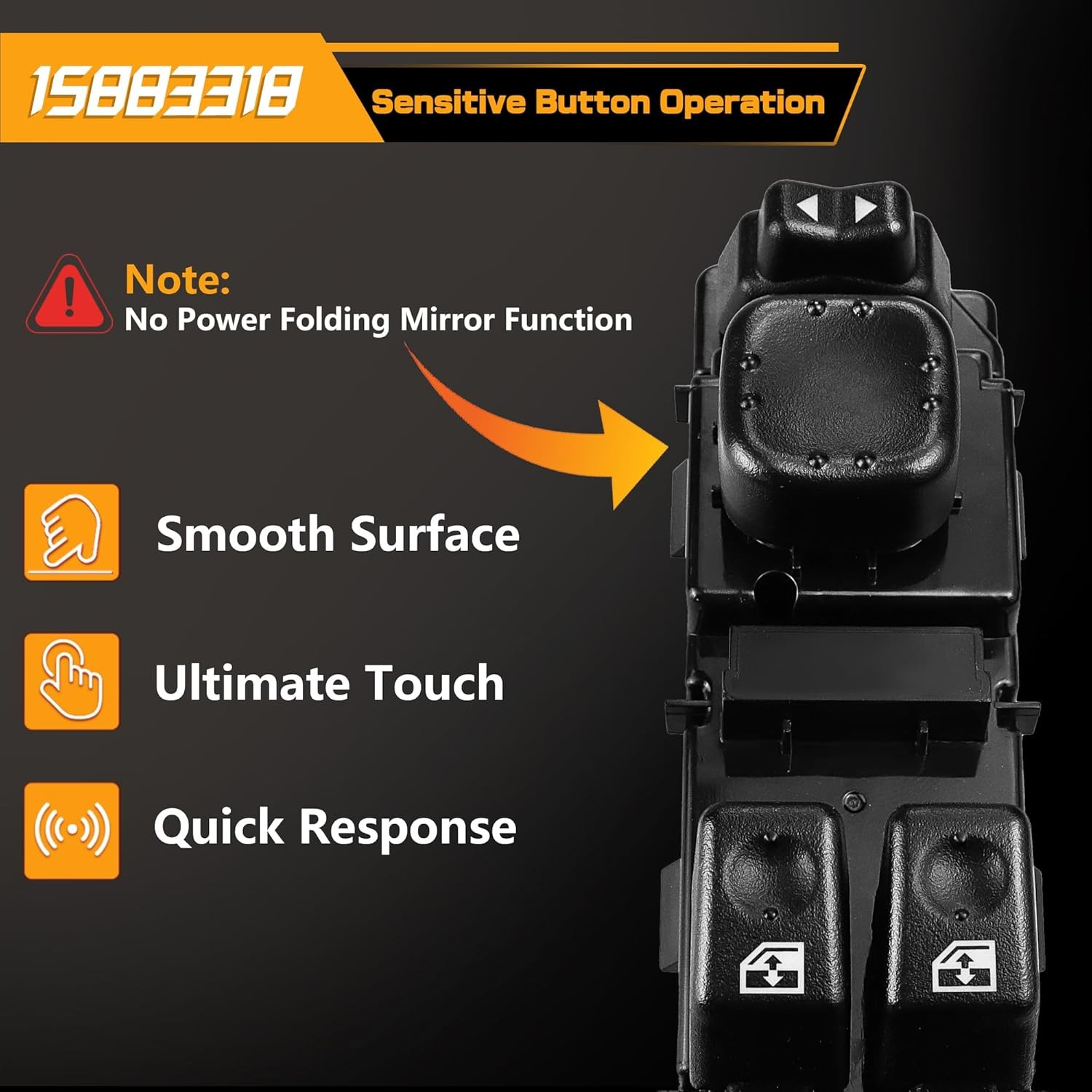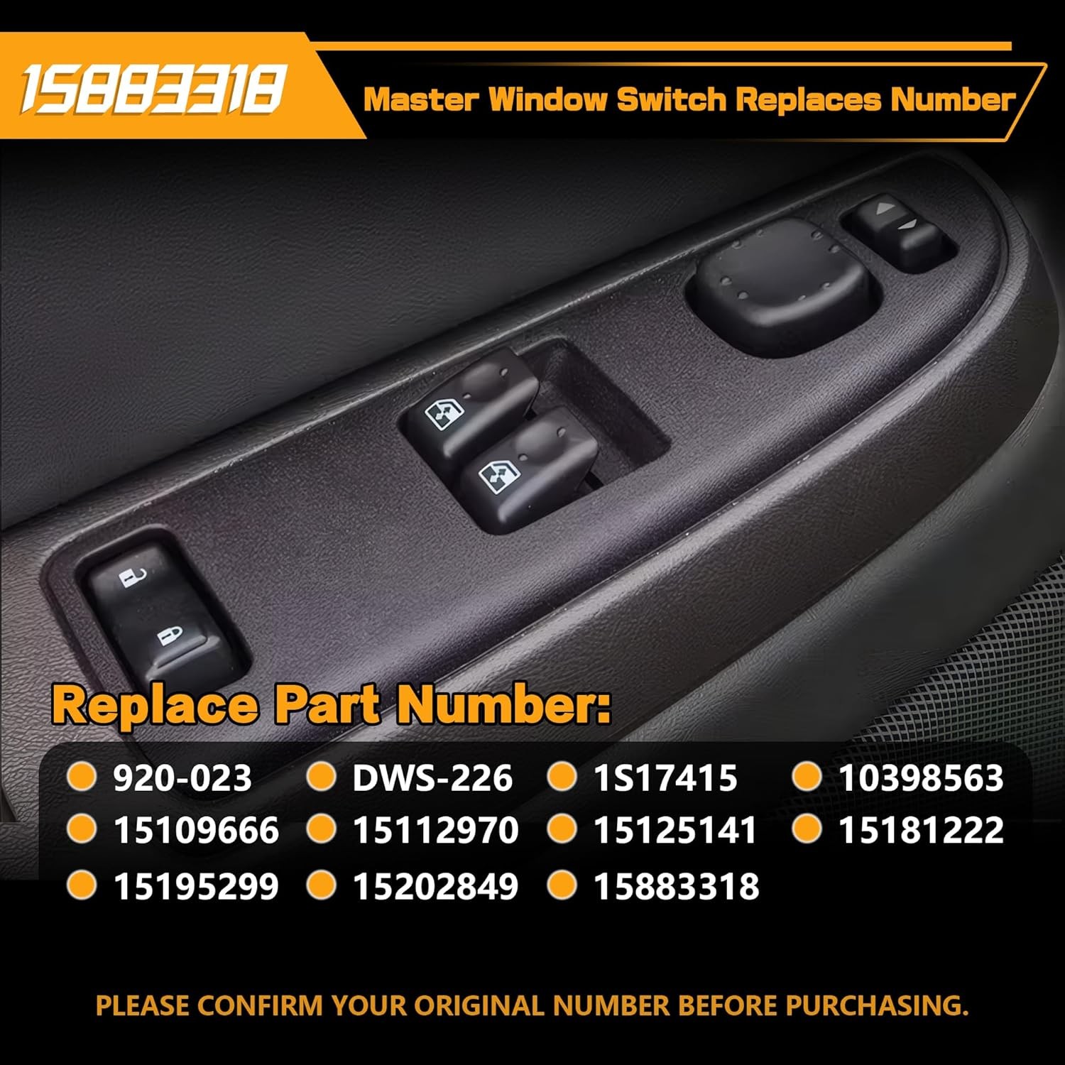 15883318 Front Driver Side Master Power Window Switch with Panel 15883318 Product Details Product Dimensions : 9.74 x 3.04 x 3.56 inches; 1.3 Pounds Item model number : 15883318 Manufacturer : YLB.&co Country of Origin : China Operation Mode: ON-OFF-ON Current Rating: 24 Amps Operating Voltage: 12 Volts Contact Type: Normally Open Connector Type: Plug In Brand: YLB.&co Terminal: Through Hole Item dimensions L x W x H: 9.74 x 3.04 x 3.56 inches Circuit Type: 5-way Actuator Type: Push Button Switch TypeMaterial: Push ButtonAcrylonitrile Butadiene Styrene Mounting TypeSpecification Met: Panel MountISO 9001 Vehicle Fitment-1: Compatible with Chevrolet Silverado 1500 03-06, Silverado 1500 Classic 07, Silverado 2500 03-04, Silverado 2500 HD 03-06, Silverado 2500 HD Classic 07, Silverado 3500 03-06, Silverado 3500 Classic 07. Vehicle Fitment-2: Compatible with Sierra 1500 03-06, Sierra 1500 Classic 07, Sierra 2500 03-04, Sierra 2500 HD 03-06, Sierra 2500 HD Classic 07, Sierra 3500 03-06, Sierra 3500 Classic 07. Precise Design: Perfect original switch replacement, very easy to install, ideal solution for your defective window switch. Premium Quality: This window door switch assembly is made of quality ABS & polycarbonate material to provide better performance and sensitive.