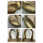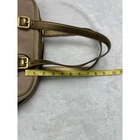 Prada satchel handbag crafted from a durable beige canvas body with striking metallic gold Saffiano leather trim. This elegant piece features the iconic enamel triangle logo on the front, dual rolled leather top handles with buckle detailing, and a secure zip-top closure. The interior is lined with signature Prada jacquard fabric and includes a zippered pocket for organization. Complete with a clochette, key, and original dust bag, this bag offers a sophisticated blend of texture and shine. Brand: Prada Material: Canvas and Saffiano Leather Color: Beige and Metallic Gold Hardware: Gold-tone Origin: Made in Italy Closure: Zipper Style: Satchel / Bowler Bag Interior: Jacquard lining with zip pocket Features: Triangle logo, clochette with key Includes: Dust bag See photos for measurements. Ships from a pet friendly, smoke-free home. Designer, Luxury, Y2K, Metallic, Glam, Italian, Chic, Classic, Neutral, Evening, Authentic, High-end, Preppy, Minimalist