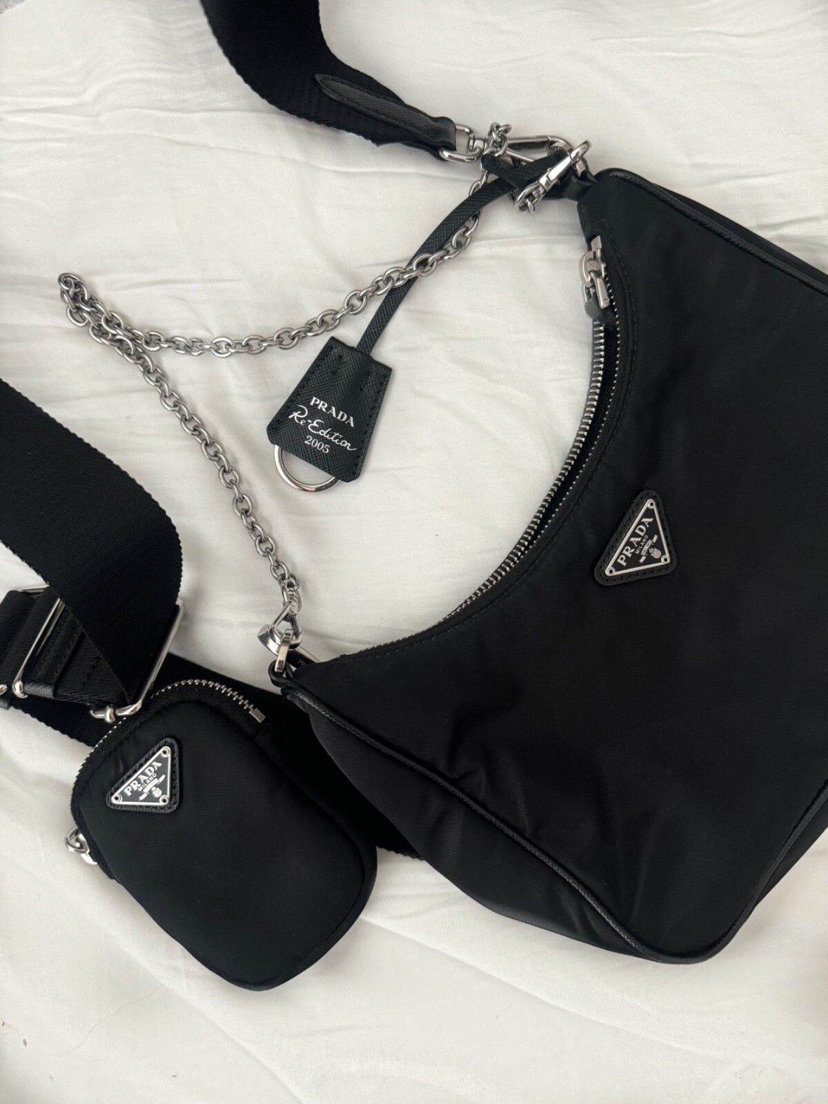 This bag is an absolute dream! The nylon is surprisingly luxurious and the silver hardware pops beautifully. It's lightweight yet fits all my essentials perfectly. I get compliments every time I wear it!