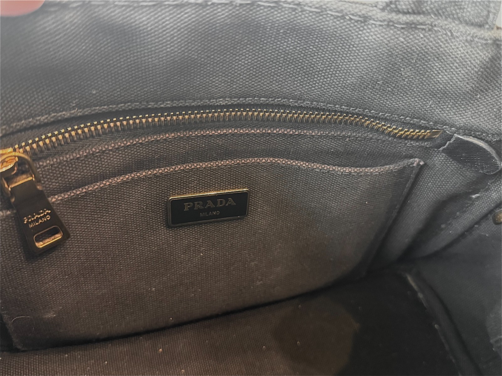 Authentic Prada Canapa Mini Tote — Black Cotton Canvas A modern Prada classic, the Canapa Mini Tote blends effortless everyday function with iconic designer styling. Crafted from durable black cotton canvas, this structured mini tote features Prada’s signature logo detailing and a timeless silhouette that transitions easily from casual daywear to polished city style. Compact yet surprisingly spacious, the Canapa Mini offers enough room for daily essentials while maintaining a refined, minimalist look. Carry it by the top handles or style it with a crossbody strap for versatile wear. A staple piece for those who appreciate understated luxury. Details Designer: Prada Model: Canapa Mini Tote Color: Black Material: Cotton canvas Structured tote silhouette Dual top handles Signature Prada logo detail Condition Good pre-loved condition with signs of normal use consistent with a gently loved canvas bag. Please review all photos for condition details. Authenticity Guaranteed. All Uptown Foundry pieces are carefully sourced and authenticated. Returns are accepted only if the item remains unused and is returned with all original packaging (dust bag, box, and inserts when applicable). Curated. Authenticated. Unapologetically Luxe.