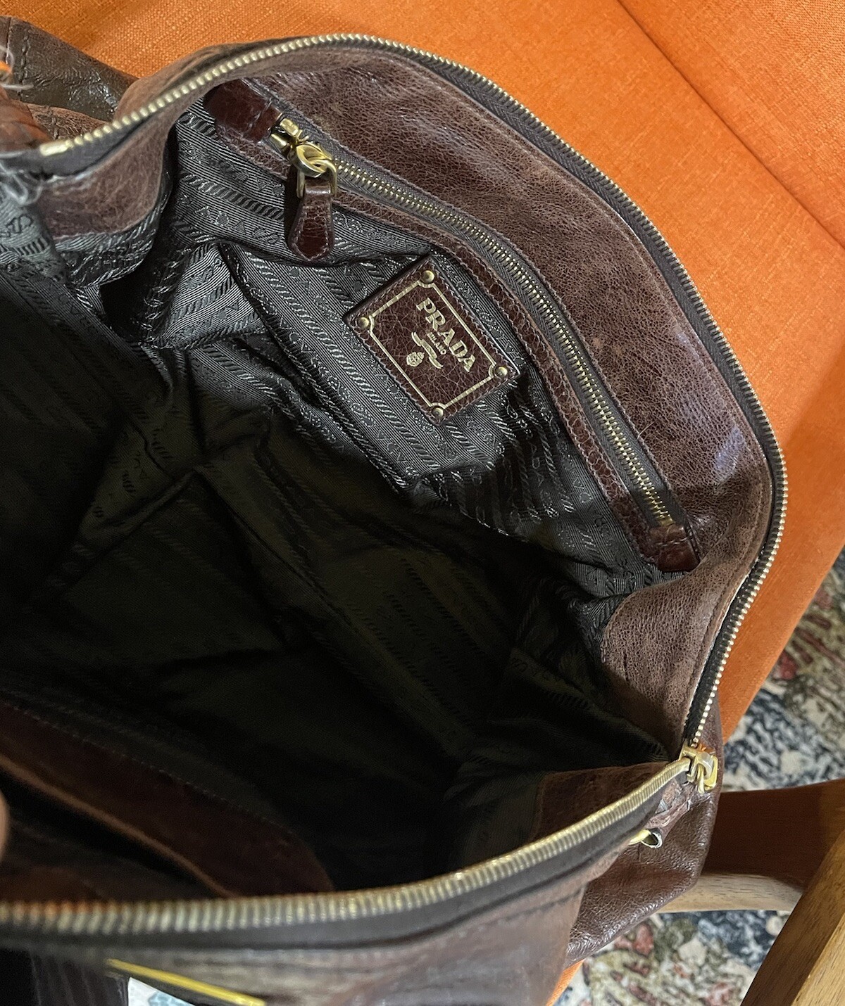 This Prada crossbody bag is a must-have for any fashion-forward woman. The extra-large bag features a zip closure and a brown handle/strap color with gold hardware. The exterior is made of high-quality leather and has a vintage look. The interior is lined with black and has a spacious compartment to hold all your essentials. The Prada Vitello product line has never been more popular, and this crossbody bag is a perfect addition to your collection. The bag is perfect for any occasion, whether you're running errands or going out for a night on the town. Don't miss out on this stunning bag! Final sale