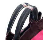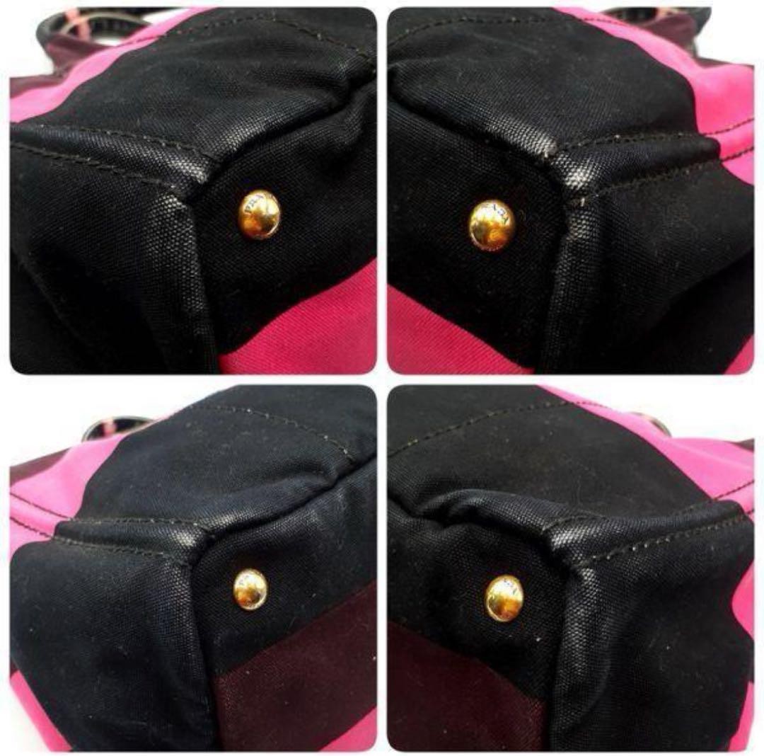 PRADA stripe design tote bag in pink, black, and brown stripes. It is a good product with scuffs on the corners, handles, and near the opening, but it can still be used. Actual size: Length 9.45 inches, width 15.75 inches, depth 9.45 inches, handle 15.35 inches. PRADA/Model number...Canapa. PRADA/Pattern/Type...Canvas. PRADA/Bag size...L. PRADA handbag tote bag Canapa border triangle plate canvas gold hardware G hardware black Pink purple for ladies. I promise fast shipping via FedEx or DHL as soon as possible! Import duties, taxes and charges are not included in the item price or shipping charges. These charges are the buyer’s responsibility. These charges are normally collected by the delivering freight (shipping) company or when you pick the item up - do not confuse them for additional shipping charges.