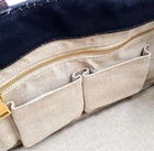 This Prada tote is a stylish and practical choice with its iconic striped canvas design in pink, black, and brown. Despite minor scuffs on the corners and handles, it remains durable and functional. The spacious interior (9.45x15.75x9.45 inches) makes it perfect for daily use, while the gold hardware adds a luxurious touch. Fast shipping ensures you get this designer piece quickly!
