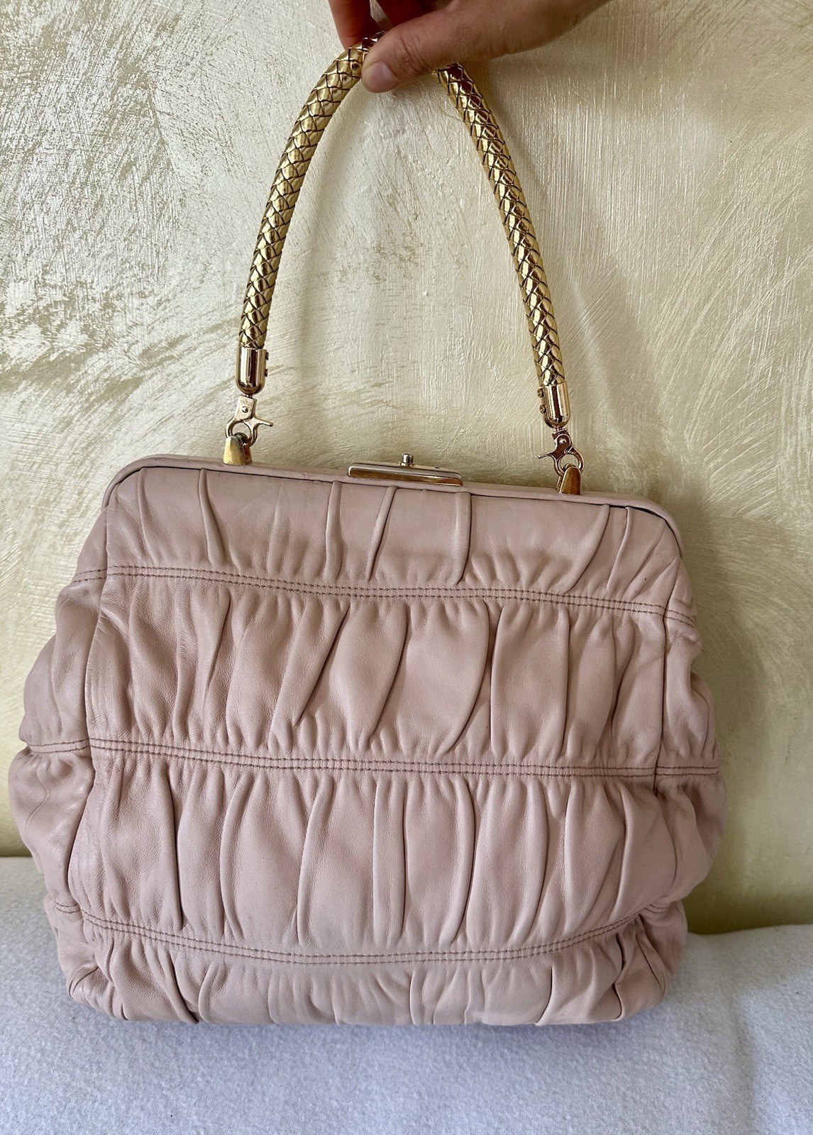 Original Prada Gaufre Leather Handbag Medium size with light pink colour. Push lock, inside contain a compartment with zip. Condition: used good condition as shown. Indicates scuffed, scratched, on the top of the corners area. Hardwares discolour. Please see the pictures. Inside, well maintained, no odour, clean. The shoulder strap has been replaced. Measurement cm. W30, H30, D9. Strap:43 approximately No come dust bag.