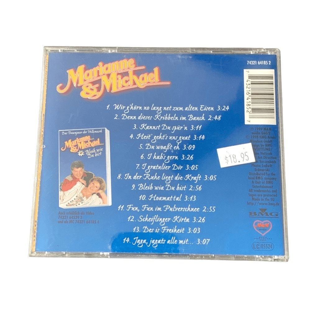 The product is a pre-owned music CD by Marianne & Michael titled "Bleib wie du bist." This German import CD features the artist's popular songs in a multicolor jewel case. The CD is in good condition and perfect for all occasions, making it a great addition to any music collection. The slimline jewel case adds a stylish touch to this musical CD.