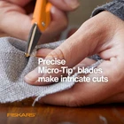 ARTS AND CRAFTS STAPLE: Fiskars Premier No. 5 Micro-Tip sewing scissors for fabric cutting and making clean cuts on intricate details and tight patterns; Designed with the original Fiskars scissors orange-handle PRECISION ART SUPPLIES: Micro-Tip blades provide superior precision making the perfect sharp scissors for tight cuts, awkward angles, quick snips, and intricate details LONG LASTING AND RELIABLE: High-grade stainless steel blades are precision-ground and cut all the way to the tip; Fiskars craft supplies and materials are built to last COMFORTABLE AND CONVENIENT: Ambidextrous double-loop handle provides excellent control and accommodates right- and left-handed users QUALITY TOOLS FOR ARTS AND CRAFTS: From scissors and cutting mats, rotary and paper cutters, to classroom essentials, scissors for kids, and quilting and scrapbooking supplies, Fiskars crafting tools are designed to help you do what you do best: express yourself INCLUDES: 1 pair Fiskars Micro-Tip Easy Action Titanium Scissors All Purpose; Full lifetime warranty Fiskars Premier No. 5 Micro-Tip Fabric Scissors elevate your creativity by providing a unique design for crisp, clean cuts on intricate details and tight patterns. Generations of sewers, artists, and makers have sought Fiskar's wide selection of premier fabric-cutting scissors for crafting and sewing. The No.5 Micro-Tip scissors combine Fiskars Original Orange-handled Scissors design with exceptional performance and features, including Micro-Tip blades that provide superior precision. High-grade stainless steel blades are precision ground to cut all the way to the tip, while a double-loop handle provides excellent control for right- and left-handed users. For every intricate detail, cut with a legend.