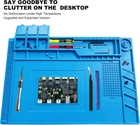 Silicone 【HEAT AND ANTI-STATIC 】 Solder pad can resist high temperature 932°F(500°C), at the same time has good heat dissipation and anti-static function, in the protection of your workbench will not be damaged at the same time can protect your line components will not be damaged 【LARGE SIZE AND MULTI-FUNCTION 】 17.7*11.8 Large size design, welding pad can provide a larger work space, to meet your multiple projects at the same time, multi-area design, make your maintenance more convenient 【HIGH QUALITY MATERIAL】 Silicone welding pad adopts high quality silicone material, high temperature resistance, anti-static, flame retardant, non-slip, no odor, no deformation, while working can also give you a comfortable working environment 【WIDE RANGE OF APPLICATION 】 Large solder pad is the ideal repair platform for laptop computers, mobile phones, cameras, electronic watches, electronic toys and other electronic products, can also be used for electric soldering iron, heat gun electronic welding. 【AFTER-SALES AND COMMITMENT】 This solder mat is specially designed for table welding, is the best gift for friends and family, if you have any questions, feel free to contact us, we will reply to you within 24 hours, I wish you a happy life Product Description Workbench pad, whether you are an electronic repair worker, or do manual, this soldering pad is a good choice for you Workbench pad, whether you are an electronic repair worker, or do manual, this soldering pad is a good choice for you Organize and Simplify : With its multi-functionality and practical features, this repair mat helps you stay organized and makes your repair work a breeze. No more searching for tiny screws or struggling to keep track of different parts. It's time to improve your work efficiency and enjoy a clean and tidy maintenance platform. Safety First : The heat insulation properties of this soldering station magnetic mat ensure your platform is protected from the high temperatures involved in soldering work. Focus on your project without the worry of damaging your workspace. Professional Grade : Whether you're a professional technician or a DIY enthusiast, this silicone repair mat is designed to meet your needs. Its quality construction and thoughtful design make it a reliable tool for a wide range of electronic repairs. Stay in Place: The anti-slip design on both surfaces of the mat ensures it stays securely in place, providing a stable work surface. No more slipping or sliding around on your desk, allowing you to work with confidence. Versatile and Practical : This electronics work mat is not limited to soldering work only. It can be used for various repair tasks, making it a versatile addition to your toolkit. From cellphones to eyeglasses, this mat has got you covered. High quality silicone material High temperature resistant Can withstand 500 degrees high temperature, to protect the maintenance table, not blown by high temperature Also has the characteristics of gathering heat, heat gathered on the pad, blowing welding CPU is also faster Resistant to oil and water If the mat is accidentally stained with oil, water and other liquids, will not penetrate the mat, just use a dry cloth or absorbent paper towels a wipe will be clean Not afraid of glue, such as AB glue, instant glue, etc., put the glue on the mat, wait for the glue to dry, gently tear on it Anti-deformation Using high-density silicone material, thickened, very elastic, anti-pull, bend at will, anti-static, soft toughness, with automatic recovery structure One solder pad, 9 core functions High temperature resistance up to 500 degrees, large working area, 1/3 larger than the traditional pad With motherboard snap area, no need to worry about the motherboard moving when working, while with screw digital positioning grid, easy to summarize With magnetic tool compartment, convenient for magnetization of tools and adsorption of parts Screwdriver hole more convenient for your tools storage, selected high-quality silicone, high temperature resistance, no odor Workbench pad with a scale to help you work, while the pad can be rolled up and folded, easy to carry without deformation Efficiency at its Best: Say goodbye to the time-consuming task of sorting and classifying small parts. With the easy-to-use part boxes and screws positions on this mat, you can quickly locate what you need, saving you valuable time during your repair projects. Protect Your Workspace : Worried about damaging your desk or work station during repairs? This magnetic silicone repair mat acts as a protective barrier, ensuring your platform remains safe from scratches, burns, and spills. Compact and Lightweight: Despite its impressive features, this repair mat is designed to be portable and easy to carry. Take it with you wherever you go and have a reliable workspace at your fingertips.