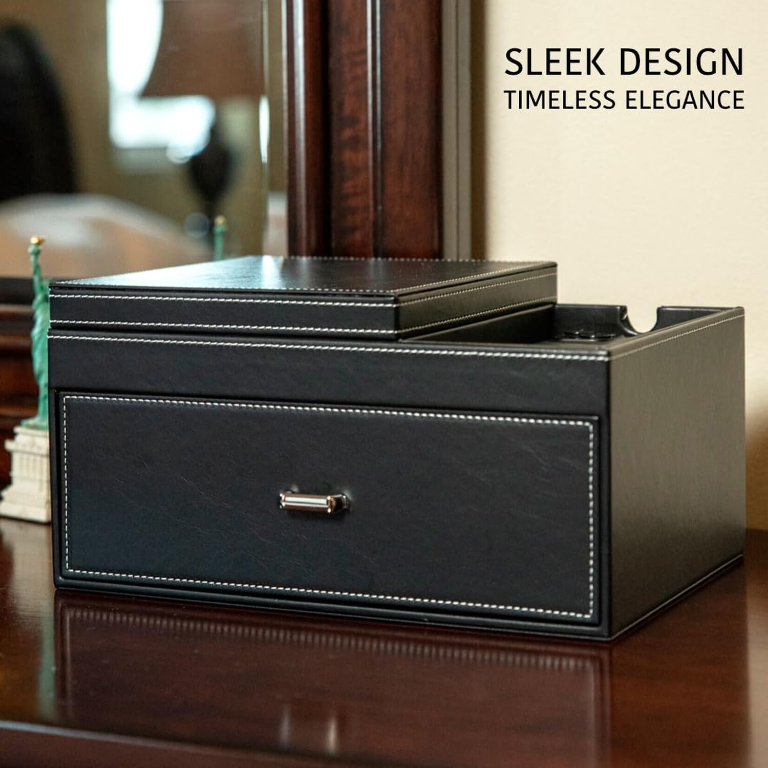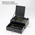 Mens Jewelry Box Organizer & Dresser Valet Tray - Premium Nightstand Station for Watches, Rings, and Accessories - Stylish Mens Dresser Top Organizer with Multiple Compartments and Soft Lining Product Details Color: Black Brand: KALETY Material: Faux Leather, Suede Style: Modern Special Feature: Removable Recommended Uses For Product: Ring Product Dimensions: 7.64"D x 10.63"W x 5.51"H Target Audience: Men Shape: Rectangular Occasion: Christmas, Anniversary, Father's Day, Birthday, Valentine's Day Item Weight: 3.4 Pounds Item Dimensions D x W x H: 7.64"D x 10.63"W x 5.51"H Manufacturer: KALETY Brand Name: KALETY Recommended Uses For Product: Ring Target Audience: Men Number of Compartments: 9 Number of Drawers: 1 Number of Items: 1 Jewelry Storage Type: Jewelry Box Mounting Type: Freestanding Closure Type: Magnetic Special Features: Removable Shape: Rectangular Occasion: Christmas, Anniversary, Father's Day, Birthday, Valentine's Day Style: Modern Color: Black Finish Type: Leather Inner Material: Leather Material: Faux Leather, Suede EFFORTLESS ORGANIZATION: Keep your phone, keys, wallet, and glasses in dedicated compartments, eliminating morning searches and ensuring you never misplace essentials again. ELEGANT PU LEATHER DESIGN: Crafted with high-quality PU leather, our nightstand organizer adds sophistication to your bedside with its timeless black color that complements any bedroom decor. AMPLE STORAGE SPACE: Three thoughtfully designed slots with plush pillows offer a safe and stylish storage solution for your treasured watch collection, allowing you to showcase their beauty. PROTECTIVE & SCRATCH-FREE: Each slot features a soft and plush interior, ensuring your valuable watches remain scratch-free, preserving their pristine condition for years to come. QUICK ACCESS & GRAB: The design allows effortless access to your essentials, even in the dark, avoiding the frustration of rummaging through cluttered drawers or knocking items off the nightstand. COMPACT & SPACE-SAVING: Designed for minimal space consumption, our nightstand organizer maximizes functionality, keeping your bedside tidy without sacrificing utility. IDEAL GIFT CHOICE: Surprise your loved ones with this practical and elegant nightstand organizer, perfect for birthdays, anniversaries, or any special occasion. It's a thoughtful gift they'll cherish and use daily.