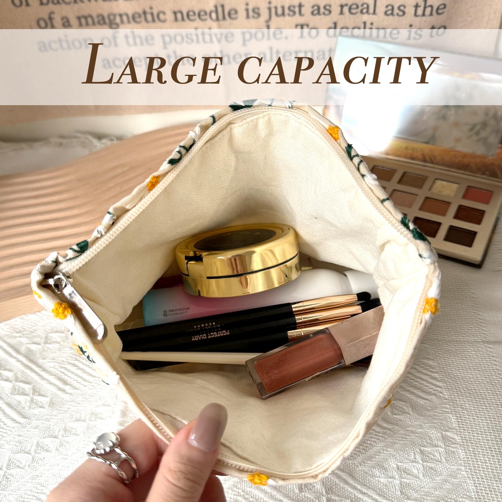 This adorable preppy makeup bag is a must-have for travel or daily use! The cute daisy embroidery adds a charming touch, while the spacious interior easily fits all your essentials. The sturdy canvas and smooth zipper make it durable yet stylish—perfect for keeping your cosmetics organized. Love the beige color—it’s neutral yet so chic! Highly recommend for anyone who loves functional and cute accessories.
