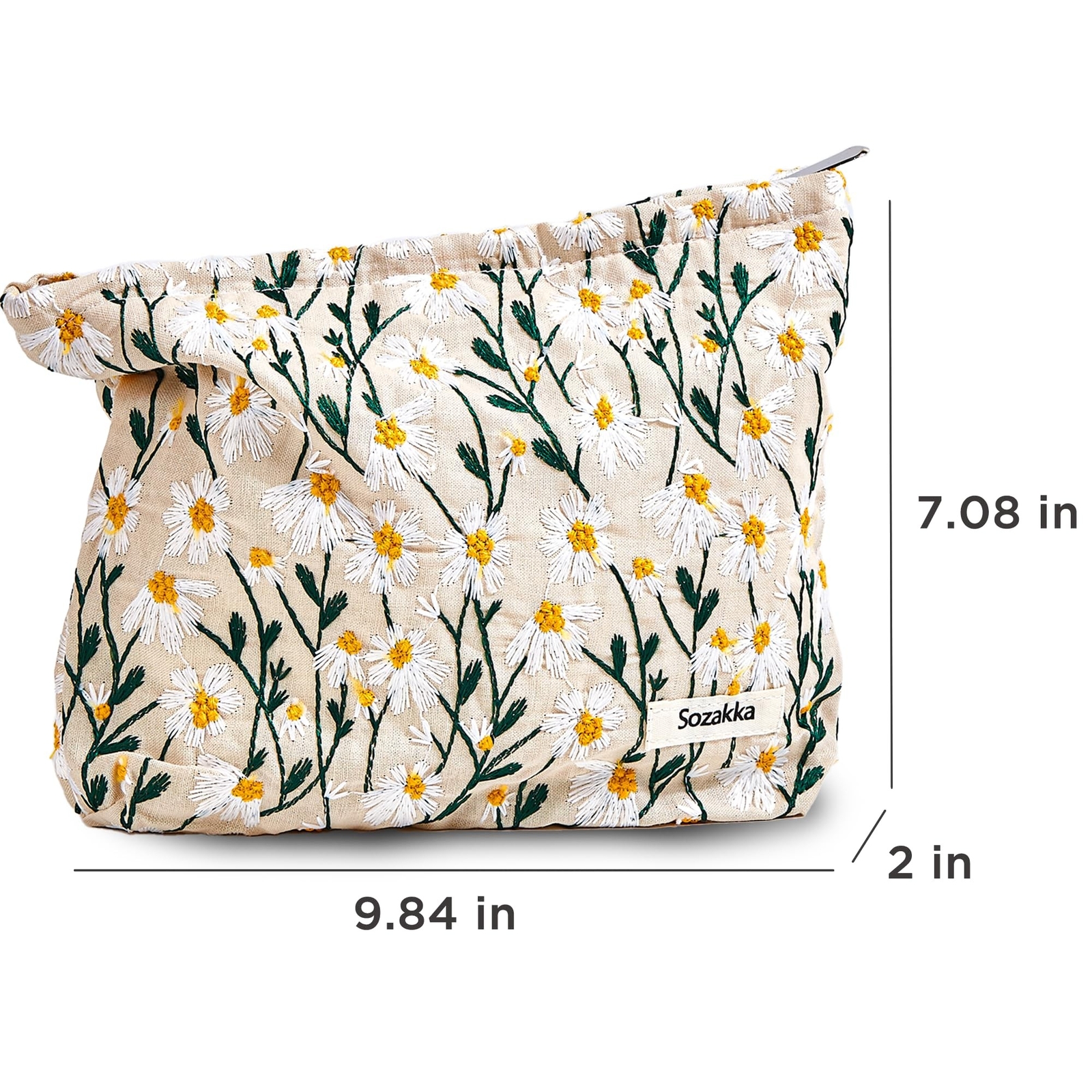 Makeup Bag Cosmetic bag Embroidery Preppy Canvas Toiletry Bag for women Cute zipper pouch Organizer Travel accessories (Little Daisy -Beige, Large) Product Details Size: Large Color: Little Daisy -Beige Brand: Sminra MPN: MU-001 UPC: Does not apply EAN: Does not apply Product Dimensions: 10.6 x 0.4 x 6.7 inches Item Weight: 2.4 ounces Department: Womens, Women, Men, Mens, Girls Country of Origin: China Item model number: MU-001 Large Capacity: Sminra Aesthetics makeup bag can hold all your cosmetic products and daily necessities. The roomy interior allows you to organize and store various makeup items, skincare products, and tools. The large zipper opening provides easy access to your products, so you can quickly find what you need. SIZE: 9.84"L * 7.08"H * 2"W. Eye-catching Embroidery Design: With trendy aesthetic patterns and colors, its visually appealing appearance sets it apart from ordinary cosmetic bags. It can easily match with different outfits in your collection, making this makeup bag a fashion accessory for any occasion Versatile Use: Whether it's used as a makeup organizer, a toiletry bag, a clutch purse, or a general storage bag, it can adapt to different needs, making it a practical accessory for anyone. Its convenient design makes it suitable for travel and daily use, keeping your essentials organized and easily accessible Premium Fabric: Made from durable double-layer polyester and canvas fabric, this makeup bag can withstand wear and tear.The sturdy fabric ensures longevity and provides reliable protection for your belongings in any situation (Machine washable) A Romantic Surprise: This cute makeup bag is a great gift for birthdays, Christmas, Valentine's Day, or as a thoughtful present for women,girl,family and friends.Sminra offers reliable after-sales service throughout the whole process and answers your questions at anytime online! Thank you for your choice