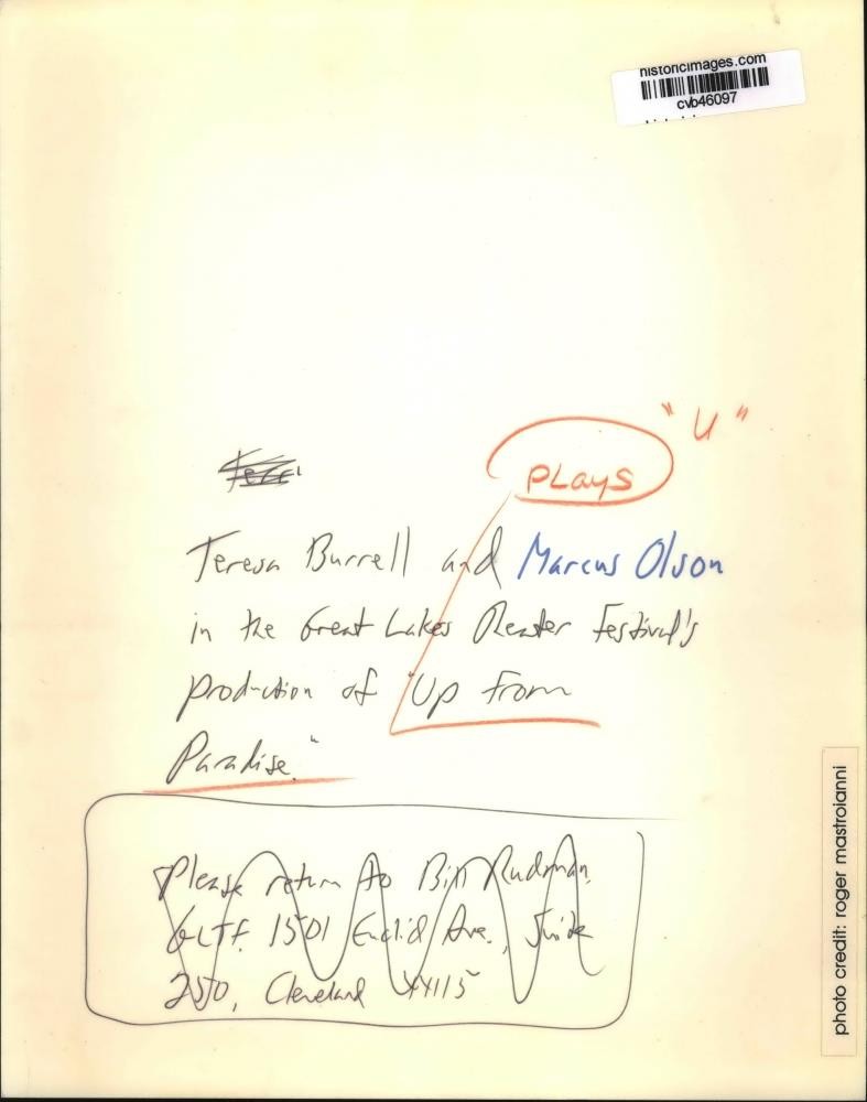 ebay template Note: Please study the images carefully to determine the condition of this vintage photograph, as it may not be in perfect condition. It may contain wrinkles, cracks, and possibly even tears due to its age and how it was handled before it got to us. A scanner may interpret colors and contrast differently than human eyes will, so it is possible that the actual photograph may be slightly darker or lighter in person. This vintage photograph is offered for sale as a collectible item and conveys no transfer of copyright. Press Photo Teresa Burrell and Marcus Olson in Up from Paradise Play This is an original press photo. Teresa Burrell and Marcus Olson in the Great Lakes Rester Festival's production of Up from Paradise, Play.Photo measures 8 x 10inches. Photo is dated --NONE. PHOTO FRONT PHOTO BACK Historic Images Part Number: cvb46097 FAQs Q: Can I just download a digital version instead? A: No, we sell only vintage originals and do not make or distribute any copies, including digital ones. Q: Do you combine shipping and invoices? A: Multiple photos won on the same seller ID combine automatically through the eBay checkout process. If you encounter problems with this, send us a message via eBay messaging and we will send you an invoice. Due to eBay limitations, we cannot combine items won on our different seller IDs for a single shipping charge. Q: How quickly do you ship the items once paid? A: We ship within one business day after your payment clears. If you do not receive an "order shipped" email from us by the close of the second business day from submitting payment, please e-mail us via eBay messaging. Q: How do you make sure my photograph arrives safely? A: We package each order between two cross-corrugated pieces of cardboard to ensure that the package is as difficult to bend as possible. We then wrap each order in a plastic sheet to help protect against moisture. We want you to rest assured that we take every precaution to ensure that the photograph you receive will be in the same condition in your care as it was in ours. Q: Will the "Historic Images" watermark be on my photo when I receive it? A: No. This is a digital watermark we use to protect our images. It is not printed on the photo. Q: What are your office hours? A: eBay for us is a business, and a very fun one to be in! We are open M-F 9 to 5 (CST). Therefore, we do not return e-mails and phone calls over the weekend. We observe the following holidays: New Years Day, Memorial Day, Fourth of July, Labor Day, Thanksgiving and the day after Thanksgiving, Christmas Eve and Christmas Day. Q: Where did all these vintage photos come from? A: These original vintage photographs are from various news service and newspaper photo archives from locations around the country including: Boston, Detroit, Tampa, Chicago, Denver, Seattle, New Orleans, Milwaukee, Portland, Spokane, and more. We do not copy or reproduce any photographs -- every item is a unique vintage piece that was housed in a news archive. Q: Can I use this photograph in my book/blog/website? A: The short answer is no. There is no transfer of copyright for republication or reproduction with these photographs when you purchase them, and only photographs taken before 1923 are currently automatically in the public domain. Permission from the copyright holder, which usually can be identified from the back of each photo, must be sought to republish or reproduce the image for any purpose. Q: Do you relist items (in case I miss an auction ending)? A: Auction items that receive no bids are relisted in our store (historicimages-store on eBay) as a fixed-price item and at a higher price than the starting auction price. Q: Do you leave feedback? A: Yes, we always leave feedback for buyers. Our software monitors when our buyers leave us feedback, then notifies us that we can leave feedback for the buyer. Rest assured, if you leave feedback, we will do the same! Check out our family of eBay IDs: historicimages01 Sports Photos historicimages02 Entertainment Photos historicimages03 Americana Photos historicimages04 International & War Photos historicimages05 Transportation Photos historicimages06 Photos of All Subjects historicimages07 Entertainment Photos historicimages08 Newsworthy Photos historicimages09 Entertainment Photos historicimages10 Sports Photos historicimages-store Our largest fixed-price selection historicimages-gallery Hand-picked photos Saturday night auctions About Us Historic Images was formed in September 2009, with a handful of scanners working out of a basement to digitize newspaper photo archives. We have since moved out of the basement, and we can now archive thousands of photos per day. Our company has worked with magazines and newspapers from Detroit, Boston, Denver, Seattle, Tampa, Chicago, and New Orleans, just to name a few. We are constantly adding to our inventory, and have assembled an archive of millions of photos to date. As our company evolved, we began our eBay business, which brings thousands of fresh auctions per week to the world's largest online auction marketplace. Our custom software systems and team of great employees allow us to efficiently scan and sell large photo archives online. At the very core of our company's DNA is a strong commitment to customer satisfaction and strict integrity for our product. Our promise to you is that we will do everything in our power to provide you a great buying experience. Copyright 2009 - Present, Historic Images, Inc. Sell Smarter with Kyozou. Inventory and Ecommerce Management