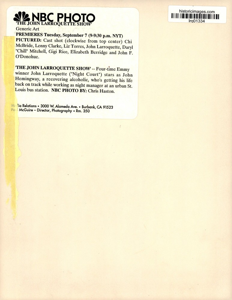 ebay template Note: Please study the images carefully to determine the condition of this vintage photograph, as it may not be in perfect condition. It may contain wrinkles, cracks, and possibly even tears due to its age and how it was handled before it got to us. A scanner may interpret colors and contrast differently than human eyes will, so it is possible that the actual photograph may be slightly darker or lighter in person. This vintage photograph is offered for sale as a collectible item and conveys no transfer of copyright. Press Photo "The John Larroquette Show" Cast Members - lrq01334 The John Larroquette Show -- Four-time Emmy winner John Larroquette ("Night Court") stars as John Hemingway, a recovering alcoholic, who's getting his life back on track while working as night manager at an urban St. Louis bus station. Cast shot (clockwise from top center) Chi McBride, Lenny Clarke, Liz Torres, John Larroquette, Daryl "Chill" Mitchell, Gigi Rice, Elizabeth Berridge and John F. O'Donohue. Photo measures 7 x 9 inches. Photo Is dated -- none. PHOTO FRONT PHOTO BACK Historic Images Part Number: lrq01334 Sell Smarter with Kyozou. Inventory and Ecommerce Management