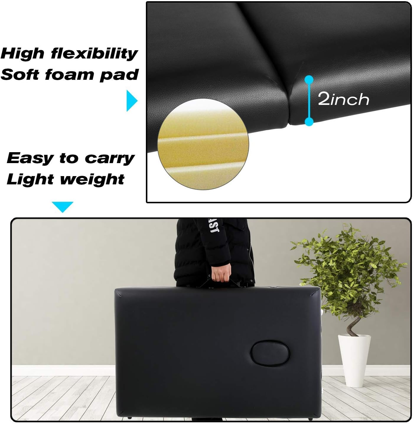 Store New Arrivals Add to Favorite View Feedback Contact Professional Massage Table 450 LBS Massage Bed Spa Bed 73” Long 2 Folding Portable Massage Table W/Carry Case Heigh Lightweight PU Leather Adjustable Salon Bed Face Cradle Bed for Esthetician Description Item model number Massage Table Item dimensions L x W x H 73 x 28 x 34 inches Item Weight 2 Pounds Style Modern Weight 36.5 Pounds Color Black Assembly Required No Shape Rectangular Product Dimensions 73 x 28 x 34 inches Material Wood Country of Origin China Assembled Width 28 inches Item Weight 2 pounds Brand HomeClever Assembled Length 73 inches Size A Is Discontinued By Manufacturer No Assembled Height 34 inches Product Care Instructions Wipe with Dry Cloth Manufacturer HOMECLEVER ✔【𝗣𝗢𝗥𝗧𝗔𝗕𝗟𝗘 𝗔𝗡𝗗 𝗟𝗜𝗚𝗛𝗧𝗪𝗘𝗜𝗚𝗛𝗧】The massage table is about 28 pounds. Portable massage table includes a durable carrying case. The headrest, hand rest, and armrests, are all removable. Easy to carry and save space! Salon Bed,Tattoo Bed. ✔【𝗡𝗢𝗧 𝗥𝗘𝗤𝗨𝗜𝗥𝗘𝗗 𝗧𝗢 𝗔𝗦𝗦𝗘𝗠𝗕𝗟𝗘 𝗔𝗡𝗗 𝗣𝗢𝗥𝗧𝗔𝗕𝗟𝗘】The massage table can be used when it is unfolded, no assembly is required. No squeaking or shaking, giving you the best comfort. The whole massage bed can be installed in a carrying case with a lock, which is not only convenient for family use, but you can also take it out for massage or spa treatments for your customers. ✔【𝗘𝗫𝗖𝗘𝗟𝗟𝗘𝗡𝗖𝗘 𝗜𝗡 𝗗𝗘𝗧𝗔𝗜𝗟 𝗣𝗥𝗢𝗖𝗘𝗦𝗦𝗜𝗡𝗚】The massage table cover draped in a luxurious PVC leather, durable, soft, and easy to clean, but spa bed has no offensive smell like other synthetic materials. The secure lock ensures safe and convenient carrying of the massage bed.Massage table massage bed spa bed. ✔【𝗦𝗧𝗨𝗥𝗗𝗬 𝗔𝗡𝗗 𝗦𝗔𝗙𝗘】The massage bed made of solid wooden legs, reinforced hardwood corner blocks for superior strength to enable up to 450lbs on the spa table. Durable spa bed can make your customer safety when enjoyed massage. Massage table portable spa bed massage bed. ✔【𝗔𝗙𝗧𝗘𝗥-𝗦𝗔𝗟𝗘 𝗦𝗘𝗥𝗩𝗜𝗖𝗘】If you have any problem during the pre-sale or during the usage, please feel free to contact with our customer service, we promise we will provide you the most professioal technical support and best solution. Featured with the round and semi-circle bolster, the folding table offers a sound and durable support during the massage. Practical and functional, this table works just like ones at professional therapy clinics and massage centers, ideal for professional therapists, therapy students, and home users alike. The massage table not only guarantees a comfortable touch to whoever lying on it but also for long-term use. Here Are The Top 3 Reasons To Choose Our massage table: ✔️MEMORY FOAM - For premium comfort, this massage table features 5 centimeter of foam - the top 2 cm is a scientifically designed memory foam and the remaining 3cm below is regular foam. ✔️EASY SETUP - This massage table only takes one or two minutes to set up and only have a few steps. Read the reviews to see for yourself! ✔️PORTABLE AND FOLDABLE - It is foldable with a compact design and a carry on bag. It even comes with a face hole in the middle for shorter people and a side pouch for oils or other accessories. 🔍 Product Features: √Comfortable and exceptionally strong massage table. √Height adjustable massage table. √Sturdy hardwood frame structure massage table. √Comes with semi-circle bolster, facial cradle, carrying bag. √Height adjustable from 24" to 34" massage table. 🔍Specifications Color:Black Material: Wooden frame, sponge Subtype: Two fold Product Size: L73"xW28"x(24" to 34" )Adjustable Height Weight:36.5 lbs Weight Limit 450 lbs ABOUT US We offer the best prices around on high quality products. Our E-store includes media such as books, movies, music and games while offering electronics, toys, sporting apparel, clothing, tools, general home, garden items and more. SHIPPING We are always working hard to ensure your package arrives as soon as possible. Please understand that some factors like weather, high postal traffic, and the performance of shipping companies are outside of our control. We offer free shipping to the lower 48 states and ship within 2 business days of payment, usually sooner. We do not accept P.O. Boxes. Please provide a physical address. RETURNS We offer a 30-Day Return Policy on items which you are not completely satisfied with. You have the option for a full-refund or an exchange of the item. No returns are available on items shipped outside of the USA. PAYMENT We accept PayPal. CONTACT US This page content is yet to come Please ad us to your favorite seller and visit again later Thank You CUSTOMER SATISFACTION We try our very best to make sure every customer is completely satisfied. If there's a problem, message us! We're happy to help.