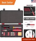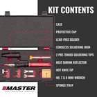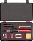 Professional Soldering Iron Kit, Butane Soldering Iron, Cordless and Portable with Adjustable Soldering Temperature, Self-Igniting, Butane-Powered, Professional 7-Piece Kit SOLDERING KIT CONTENTS: Our kit has a professional butane soldering iron, two (2) pre-tinned solder tips, a hot knife tip, a heat shrink reflector, lead-free solder, a sponge/tray, and a protective cap. All of these are placed in a hard-shell case. You get all the soldering tools you need in one pack. CORDLESS AND PORTABLE: Using butane fuel, you can solder conveniently without dealing with tangled wires. You can perform soldering or welding work freely because our butane-powered soldering is lightweight. Weight: (.21 lbs; 93 grams) without fuel. ADJUSTABLE SOLDERING TEMP: Easily control the cordless soldering iron's temperature from 635°F to 900°F (335°C to 482°C) and solder different temperature applications. The feature makes it easier to deal with heat-sensitive or temp-specific components. Our soldering iron also has an adjustable open flame function (butane torch). LONGER RUN TIME: portable soldering iron has a refillable tank capacity of approximately One butane refill will last up to 75 minutes of run time. For better performance, fuel the soldering irons with our Master Ultratane butane fuel. MULTIPLE APPLICATIONS: Our butane soldering iron kit is designed to shrink electrical connectors, shrink tubing, cordless soldering, light gauge welding, and for installation and repairs in electronics assembly. It is also used as an open flame torch, making it a highly-functional addition to a soldering station.