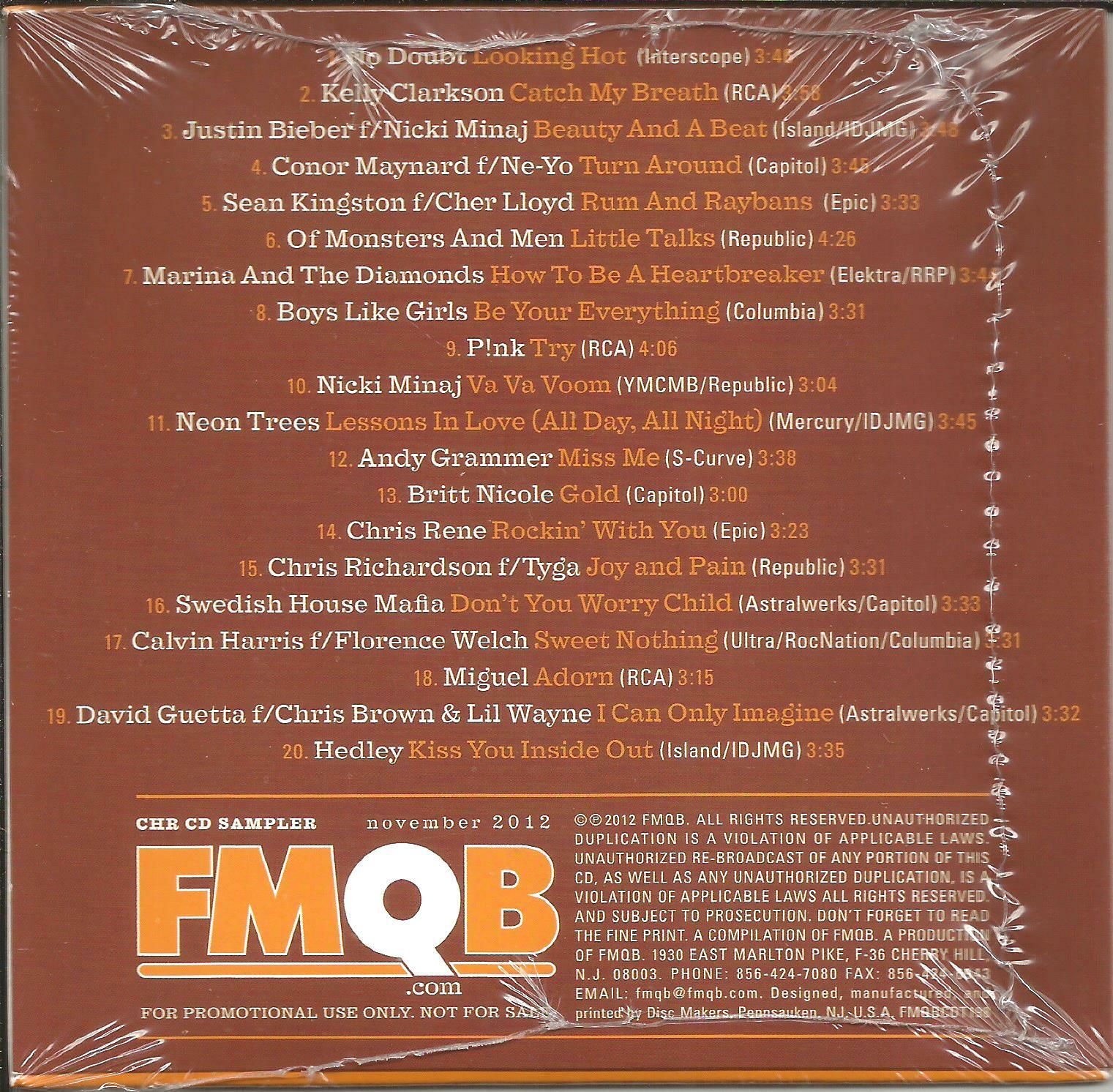 Novemebr 2012 STILL SEALED MINT condition CD and MINT condition packaging This was a PR0M0 ONLY AND WAS SENT TO SELECT RADIO STATION ONLY,. THIS IS A SERIES OF CD’s THAT COME OUT TO SELECT RADIO PROGRAMMERS ONCE A MONTH AND ARE MADE IN ULTRA LIMITED QUANTITIES THIS WAS NEVER AVAILABLE TO THE PUBLIC. . SOME OF THE ARTIST FEATURED ARE NO DOUBT, KELLY CLARKSON, PINK, NICKI MINAJ, JUSTIN BIEBER, NEON TREES to Name a few THIS WAS MADE IN ULTRA LIMITED QUANTITY The tracks are: SEE 2 ND PICTURE FOR TRACK DETAILS THESE ARE FACTROY PRESSED and 100% OFFICIAL , and released by tfmb, and the stock number is:CDT198 The CD comes in a in a thick card stock paper Sleeve International shipping is available PLEASE SEE MY OTHER ITEMS FOR OTHER ITEMS BY ALL THESE ARTSISTS and WE DO COMBINE SHIPPING Sale of this item is specifically allowed under the copyright laws of the United States {17 USC 109(a)} which states that "the owner of a particular copy or phonorecord lawfully made...is entitled, without the authority of the copyright owner, to sell or otherwise dispose of possession of the copy or phonorecord". THIS ITEM IS 100% OFFICIAL AND RELEASED BY THE RECORD LABEL, if you have any questions or concerns about this item please contact us and we can resolve any issue immediately