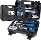 Prostormer 93-Piece Tool Kit, Basic Household Repair Tool Set with Toolbox Storage Case, Small Starter Tool Box Kit for Homeowners and College Students Product Details Brand: Prostormer Included Components: Claw Hammer, Slip Joint Pliers, Cutting Scissors, Utility Knife, Bit Driver, Tape measure, Wood Screws Assortment Kit, Precision Screwdrivers, Hex Keys, Driver Bits Claw Hammer, Slip Joint Pliers, Cutting Scissors, Utility Knife, Bit Driver, Tape measure, Wood Screws Assortment Kit, Precision Screwdrivers, Hex Keys, Driver BitsClaw Hammer, Slip Joint Pliers, Cutting Scissors, Utility Knife, Bit Driver, Tape measure, Wood Screws Assortment Kit, Precision Screwdrivers, Hex Keys, Driver Bits See more Global Trade Identification Number: 08011474113044 [High Quality Material] - Made of high-quality steel and finished in heat treated chrome, durable and corrosion resistance. Handles made of TPR material, comfortable for grip. [Muti-Purpose Tools Kit] - 93Pcs tools set for everyday household small repair jobs and DIY projects. It is perfect hand tool kit to have at home, garage, office, dorm, apartment. [Storage Toolbox Included] - This Tool kit comes with a sturdy blow-molded toolbox for organized storage and portability. Its sturdy interiors and organizers keep all tools in place. [What's in the Box] - 93pcs daily-use tools are in the box: claw hammer, slip joint pliers, utility knife, cutting scissors, tape measure, bit driver, 2pcs precision screwdrivers, 8pcs metric hex keys, bit connector, 30 screwdriver bits and wood screw assortment kit. [Great Gift Choice] -This tool kit is a great gift choice for family and friends, ideal for Father's Day, Christmas, birthday, housewarming and more special occasions. Kindly Tip: When opening the toolbox, please place the side with ''Prostormer'' logo on the top to prevent the tools falling out from the box.