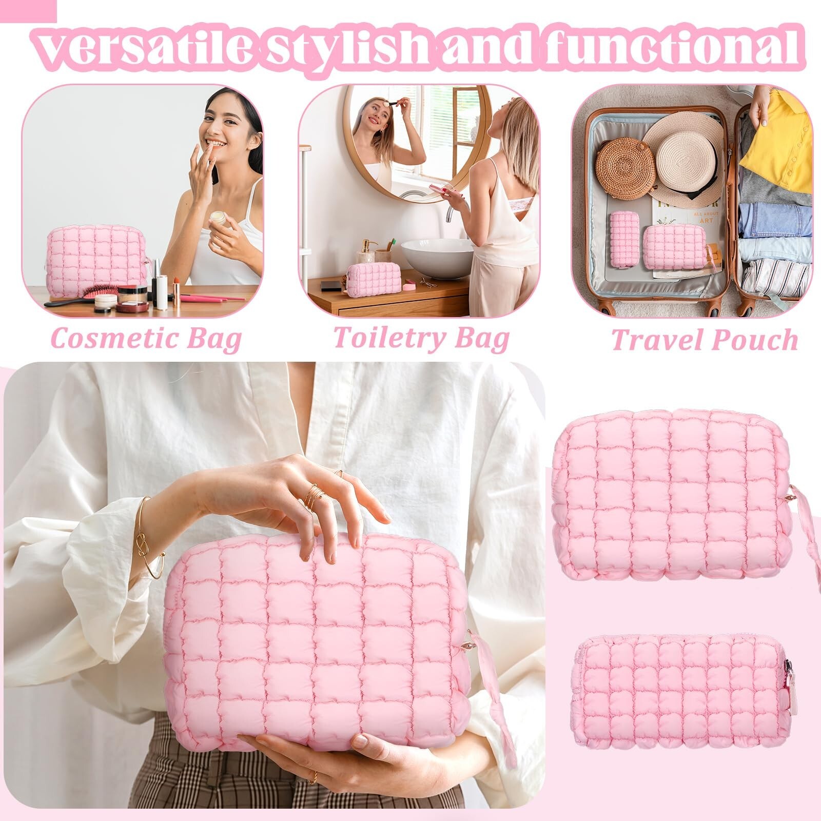 Meanplan 2 Pcs Puffy Quilted Makeup Bag Puffer Cosmetic Bag Travel Solid Cute Organizer Checkered Makeup Pouch for Women Product Details Color: Pink Brand: Meanplan MPN: LO-Meanplan-3019 UPC: Does not apply EAN: Does not apply Product Dimensions : 13.77 x 5.9 x 3.93 inches; 10.56 ounces Item model number : LO-Meanplan-3019 Department : Unisex Manufacturer : Meanplan Country of Origin : China Puffy Quilted Makeup Bag Set: Includes 2 pcs pink puffy quilted cosmetic bags, the large size is 9.9 x 2.8 x 6.3 inches / 25 cm x7 cm x 16 cm, the small size is 7.9 x 2.8 x 3.2 inch / 20 cm x 7 cm x 8 cm; It is a practical accessory for various occasions Large Capacity: These puffy checkered makeup pouches provide ample space, with 3 pockets inside the large size, 1 pocket inside the small size; Specially designed to safely store smaller items such as lipstick, eyeliner, tweezers or travel essentials Quality materials: The solid puffer toiletry bag is made of quality nylon fabric, which is soft and comfortable to touch, durable and easy to clean; Travel puffy makeup pouch adopts sewn cotton cloth and zipper closure design to ensure easy access Multi-function: In addition to carrying cosmetics, you can also use this cute puffer toiletry bag as a travel essential bag, daily purse organizer, vacation bag, or travel accessories bag; It is your portable organizer Ideal Gift: our quilted makeup organizer storage bag is suitable for various occasions, such as Christmas, Valentine's Day, birthdays, Mother's Day, Thanksgiving and anniversaries; It is an ideal gift for friends and family Features: Convenient design: the women's travel cosmetic bag features a wide opening design, allowing you to quickly find the cosmetics you need, such as lipstick or eye shadow, etc.. Avoid wasting time Wide range of uses: this solid color puffy cosmetic bag is suitable for various activities such as shopping, traveling and vacationing. Its versatility makes it a practical accessory for various occasions. Specifications: Material: nylon Color: pink Size: Large Makeup Bag Size: 9.9 x 2.8 x 6.3 inches / 25 cm x 7 cm x 16 cm (L x W x H) Small Makeup Bag Size: 7.9 x 2.8 x 3.2 inches / 20 cm x 7 cm x 8 cm (L x W x H) Package Includes: 2 x Puffy Quilted Makeup Bag Notes: Due to manual measurement, there may be slight errors in size. Colors may vary slightly due to different screen displays.