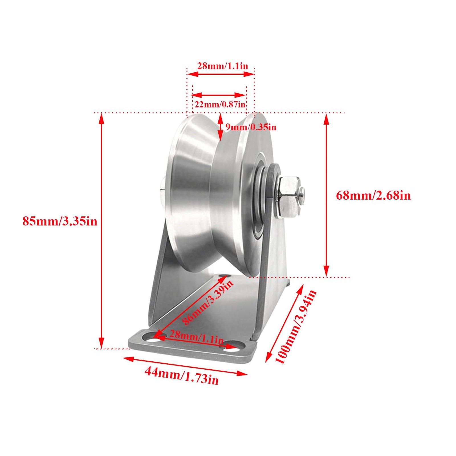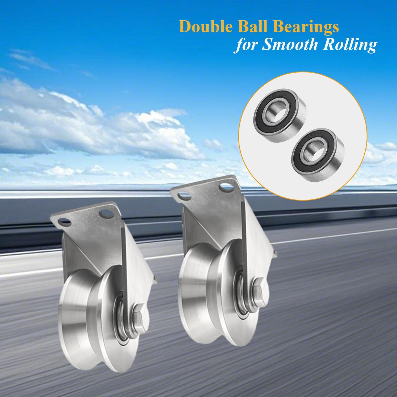 Upgrade your machinery and equipment with our Heavy-Duty Stainless Steel V-Groove Plate Casters. Designed to handle heavy loads, these casters are perfect for industrial use, offering reliable performance in warehouses, factories, and workshops. Premium Stainless Steel Construction: Built to last, these sliding gate rollers are made from high-quality stainless steel, durable to use. Double Ball Bearings for Smooth Rolling: Equipped with double ball bearings, these plate casters provide smooth, quiet, and effortless rolling, reducing friction and wear over time. Strong Load Capacity: The load capacity of 3inch caster wheels is up to 500kg/1102lb. Easy Installation and Maintenance: The plate mounting system of the track roller ensures easy installation, while the durable construction requires minimal maintenance, saving you time and effort. V-Groove Design for Track Compatibility: The V-groove design allows for seamless movement on tracks, making these pulleys ideal for industrial applications, machinery, and heavy equipment.