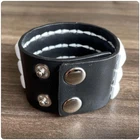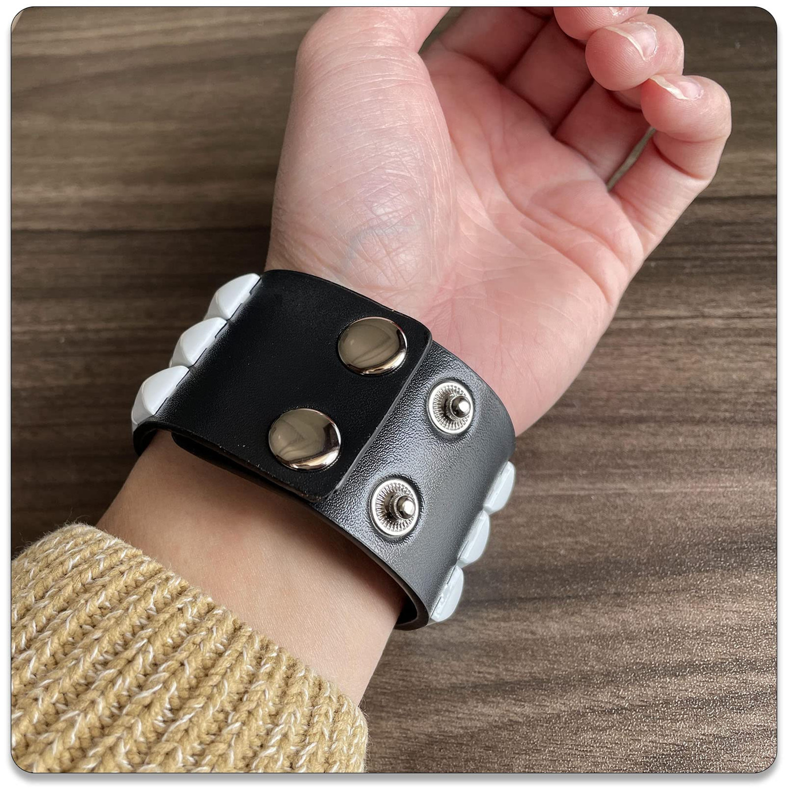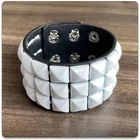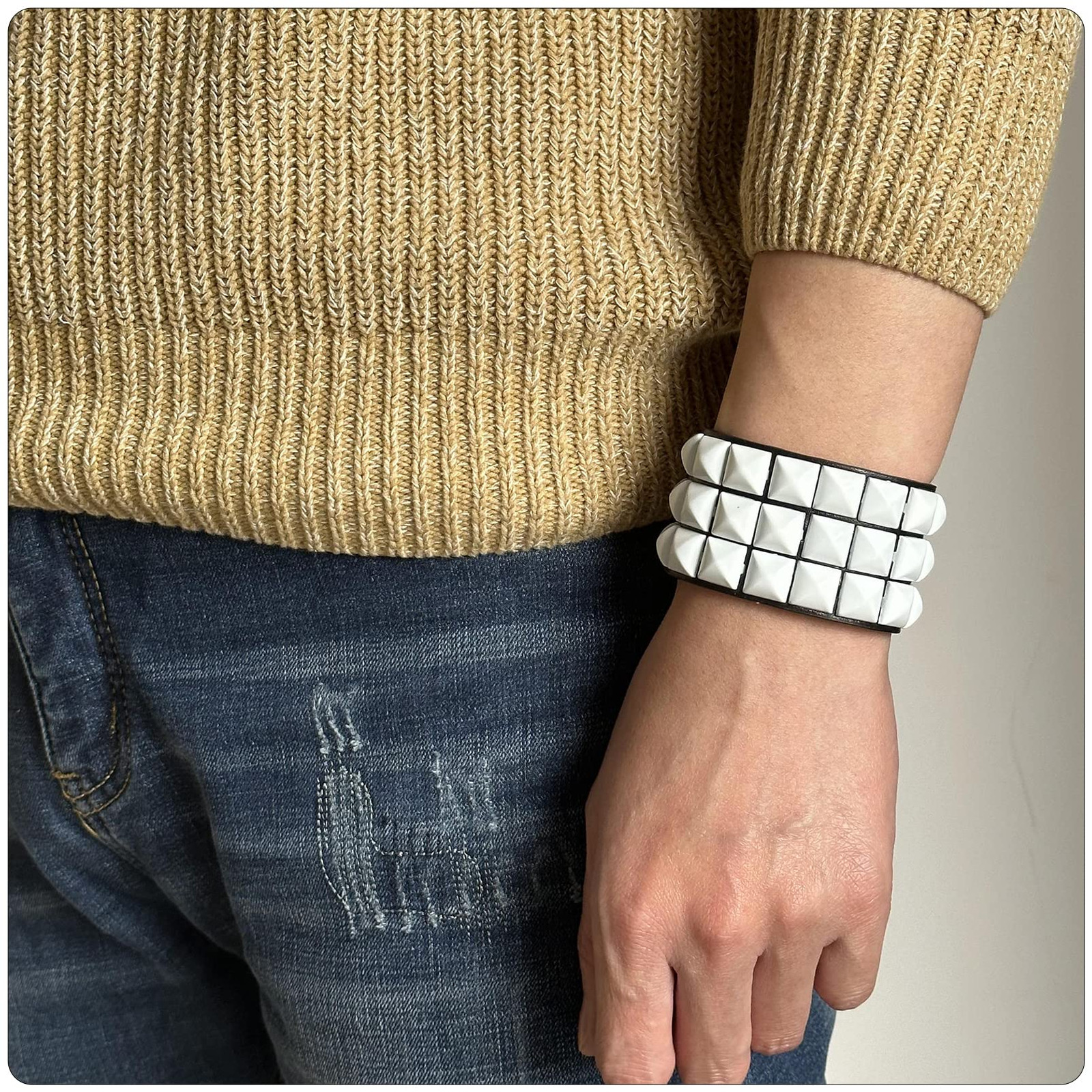Alloy and pu leather material pyramid rivet cuff bracelet. Product Features: Alloy and pu leather material pyramid rivet cuff bracelet. Bracelet Weight:37.0g. Bracelet Length:8.86"(225MM). The bracelet has an adjustable clasp, making it easy for users with different wrist sizes to make adjustments to ensure a comfortable fit. This punk style pyramid rivets wide PU leather bracelet from brand reflects a strong punk style and uninhibited personality with its wide design and pyramid rivets decoration.