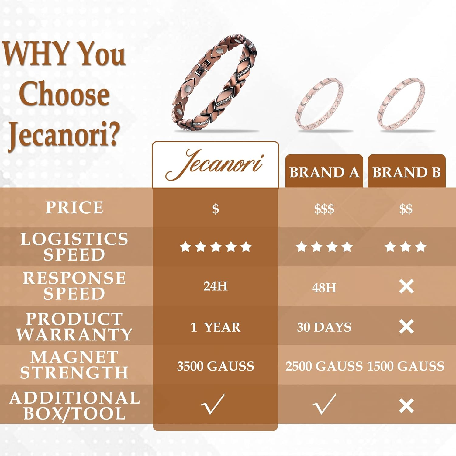 COPPER MAGNETIC BRACELETS:100% HYPOALLERGENIC, LEAD & NICKEL FREE, Made of Solid Copper and Top Techniques that create, long lasting lacquer coating to avoid oxidation, scratches resistant. MADE WITH LOVE:Generous,Practical,Beautiful.Elegant stylish design for women,suitable for many occasions.The copper bracelet must be a elegant birthday gift,Valentine's Day gift,Christmas day gift,anniversary gift for yourself or your mom,wife. A BEAUTIFUL CRYSTAL BRACELET: The bracelet is embedded with multiple crystals, the sparkling crystal bracelet is suitable for the sparkling you. ADJUSTABLE BRACELETS:Length about 8.07-8.46 inch(20.5-21.5cm),Width: 0.27 inch(0.7cm),Weight: 40g.Come with free sizing tool and instructions to allow you to adjust the bracelet length easily at home.The timeless design will compliment your individual style and can be worn for any occasion. A JEWELRY GIFT:The copper bracelet comes with a dedicated box,cleaning cloth,and sizing tool.Imagine how glad your lovers or friend could receive such a beautiful gift.Having such an item is not only an enjoyment of the beauty, but also a manifestation of temperament. Product description The video showcases the product in use. The video guides you through product setup. The video compares multiple products. The video shows the product being unpacked. More Styles Add to Cart Add to Cart Add to Cart Add to Cart Customer Reviews 4.6 out of 5 stars 385 4.3 out of 5 stars 985 4.6 out of 5 stars 397 4.5 out of 5 stars 635 4.5 out of 5 stars 635 4.4 out of 5 stars 2,029 4.4 out of 5 stars 568 Price $19.75 $ 19 . 75 $15.16 $ 15 . 16 $29.99 $ 29 . 99 $26.99 $ 26 . 99 $26.99 $ 26 . 99 $15.99 $ 15 . 99 $17.99 $ 17 . 99 Adjustable ✔ ✔ ✔ ✔ ✔ ✔ ✔ Color copper copper copper copper copper copper sliver&gold Style Classic Classic Classic fashion Crystal Classic Heart Suitable for Gift ✔ ✔ ✔ ✔ ✔ ✔ ✔ Material copper copper copper copper copper copper Titanium steel