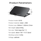 Q100 17inch Gaming Laptop Cooler Fan Led Screen Two USB Port 2600RPM Laptop Cooling Pad Notebook Stand For Laptop Description: It is both a radiator and a computer stand.Well-designed 4 stalls to your cervical spine health. The twin turbo fan ensures more noise while ensuring greater wind power and increased heat dissipation rate. The use of low-noise turbo motors allows your love machine to dissipate heat in the strong wind while reducing the noisy noise, giving you a quiet space. Fully compatible with mainstream notebook models on the market, solving the trouble of size mismatch after purchase.Universal under 17 inches. Specification: Product model: Q100 Product material: metal + ABS Product size: 350mm*250mm*27mm Product net weight: about 644 grams Fan size: 14CM large fan*2 Fan speed: about 140*15 (1, 2pcs) Working current: 0.22A Working voltage: USB5VDC Specifications: Turbo dual fan, adjustable wind speed, silent and silent. It is both a radiator and a bracket, four-gear card position is adjustable Dual USB ports, metal panel, stronger heat dissipation. Package Included: Radiator*1 USB power supply line*1 Notes: This model is the basic model, the wind speed is fixed.