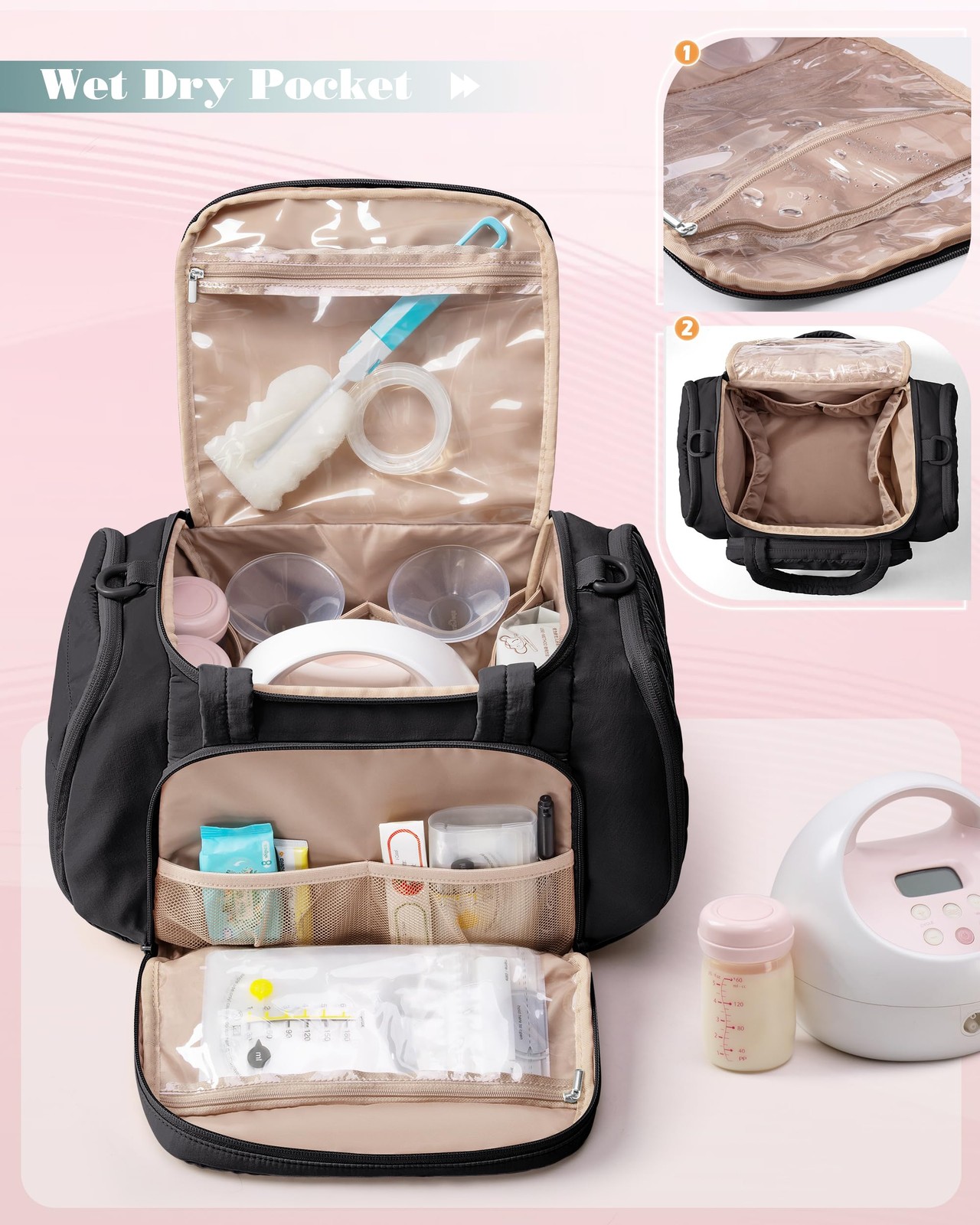 Lightweight Breast Pump Bag LIGHTWEIGHT & PORTABLE: Made of water-resistant taslan fabric which is lightweight and soft. Padded handles, a detachable shoulder strap and a luggage strap make it easy to carry. LARGE CAPACITY: Spacious interior easily accommodates the Spectra S1/S2 breast pump, bottles, flanges and other pumping parts. A top wet dry pocket stores damp items. Convenient front pockets keep small essentials neatly organized. BUILT-IN COOLER: side pocket with insulation to keep breast milk bottles at a stable temperature during transport. The other side pocket fits a full pack of wet . PACKAGE INCLUDED: A breast pump bag (10”L x 8.5”W x 9”H) and a drying mat (13.75” x 11.5”). VERSATILE USE: This pump bag is designed to meet both your home storage and transport needs. It’s also ideal as a small diaper bag or everyday bag for busy moms.