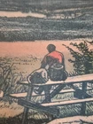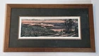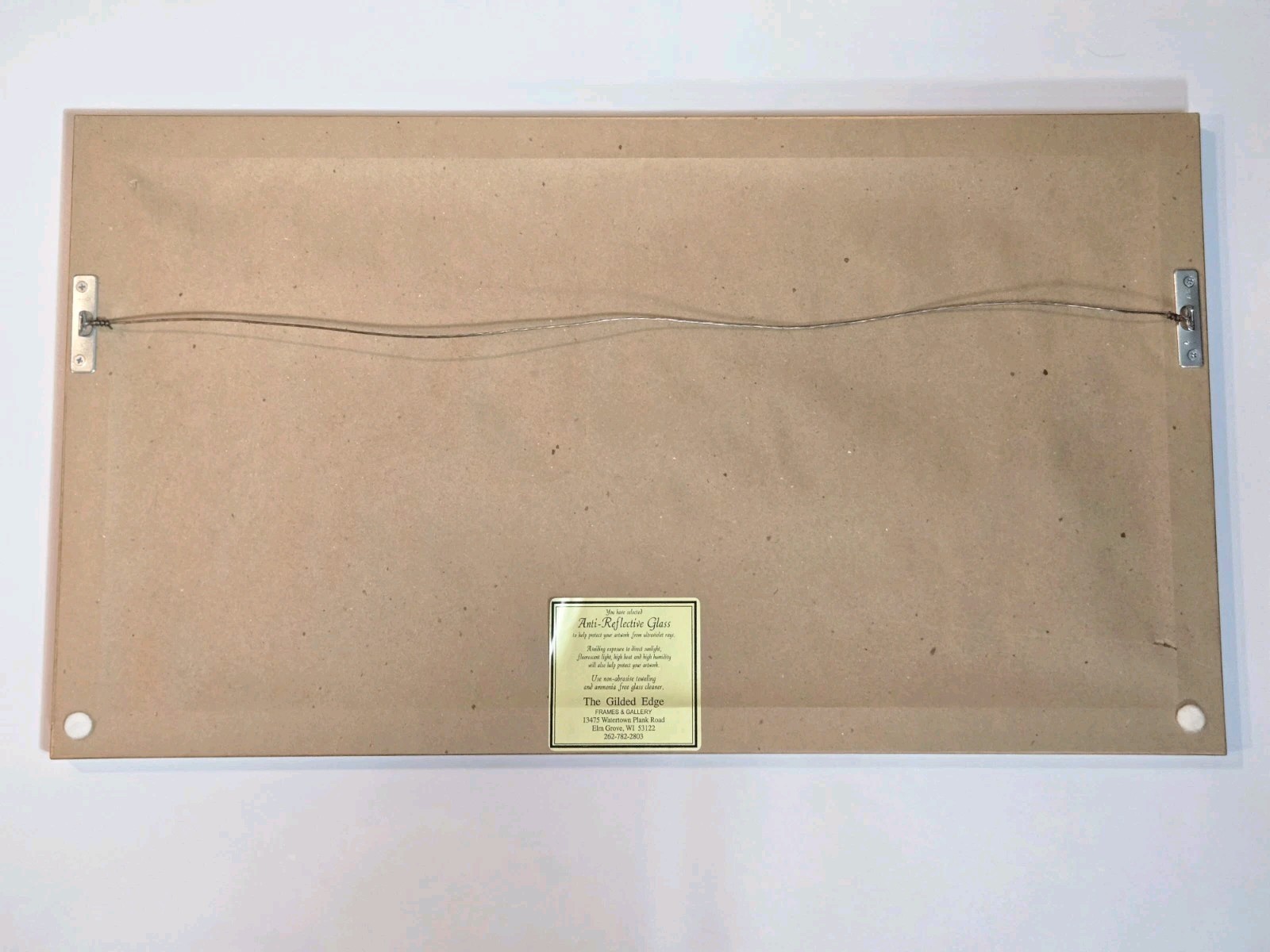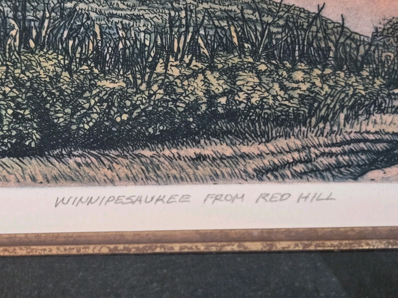 This hand-colored, signed, and numbered limited edition print by R. Loos captures a quiet lakeside moment—a view from Red Hill overlooking Lake Winnipesaukee in soft blush and earth tones. It is the kind of peaceful scene that makes you want to grab a cup of coffee, sit on a bench, and just breathe. There is something warm about R Loos art, something that makes you want to slow down and just take a look at the little intricate lines. He is a hug wrapped in a painting. --- Artwork Details: Title: Winnipesaukee from Red Hill Artist: R. Loos (Ryland Loos) Medium: Hand-colored print Edition: 99/200 – Signed and numbered in pencil Framed Size: 23” W x 13” H Frame: Wood with dark green mat and gold accent Display-ready: Wired and ready to hang Condition: Excellent—colors are rich, the frame is clean, and the glass is intact --- About the Artist – R. Loos: R. Loos (Ryland Loos) is a New England-based artist known for his intricate hand-colored etchings and prints that celebrate the landscapes of the Northeast—especially the lakes, forests, and rural charm of New Hampshire and Maine. His work blends old-world printmaking detail with soft, contemporary color palettes. Every piece is hand-pulled, hand-colored, and often personally signed and numbered in small edition runs. Loos’s prints have become local collector favorites—often found in cottages, lake homes, and art fairs throughout the region. He’s celebrated for capturing the quiet moments in nature that feel both timeless and deeply personal: a bench under a tree, a coastal horizon, or a glimpse of light over water. Each piece carries the warmth of memory and the precision of craftsmanship.
