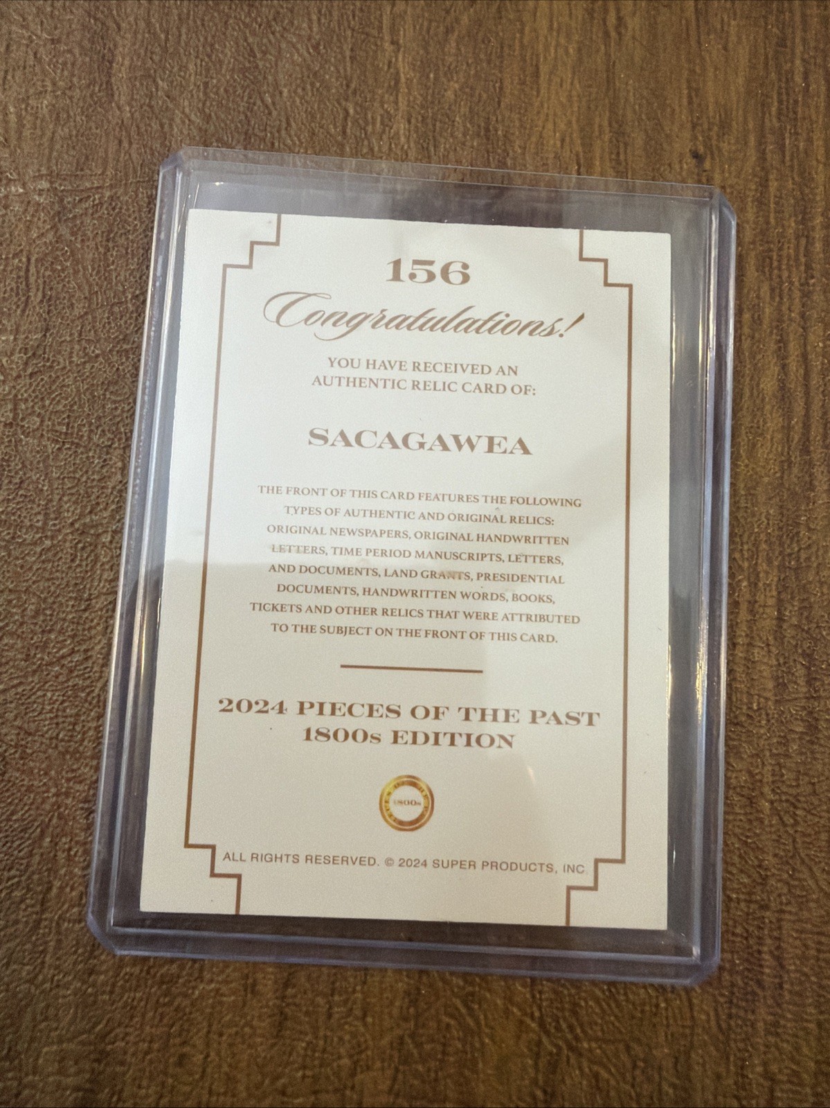 The product is a rare 2024 Pieces of the Past 1800s Edition Sacagawea Handwriting Relic trading card, featuring an original hand-written relic of Sacagawea. Manufactured by Super Products Inc., this English-language card is part of a relic card insert set. The card, numbered 156, is a part of the History franchise and falls under the genres of political and history. A standard-sized card made of card stock, it is a valuable piece for collectors interested in historical artifacts and unique pieces of the past.