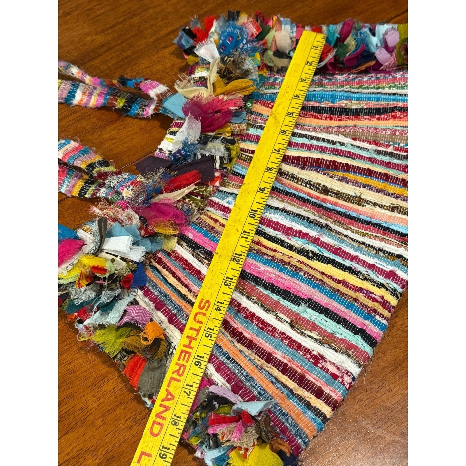 Embrace vibrant artistry with this unique boho woven shoulder bag. Handcrafted with a dazzling array of colorful woven stripes, this tote exudes a playful yet sophisticated charm. Perfect for adding a pop of personality to your everyday look or carrying your essentials in style to a music festival, a weekend getaway, or a casual brunch. Measurements: • Height: 12 in • Width: 15 in • Strap drop: 10 in Exterior Material: Viscose Style: Tote Exterior Color: Denim Multi Department: Women Lining Color: Black Handle/Strap Material: Cotton Handle/Strap Color: Multicolor Lining Material: Fabric Closure: Zip Bag Width: 18 in Bag Height: 15 in Bag Depth: 4 in Keywords: bohemian, tote bag, handmade, textured, fringe detail, colorful, woven, ethnic, artisanal, unique, travel, everyday, statement bag, ethnic chic Condition: Excellent. No rips, holes or stains. Measurements: Please compare measurements to something you already own and love. Shipping: We ship all items within two business days.