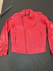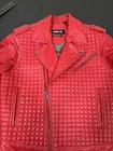 The RARE Pelle Pelle Customs Marc Buchanan Red Leather Cafe Racer Jacket in size 40 medium is a stylish and unique men's jacket. Made from high-quality leather, this bomber jacket features a bold red color with a cafe and motorcycle theme, perfect for those who appreciate vintage fashion and hip hop style. The Pelle Pelle brand adds a touch of nostalgia and edginess to this classic piece, making it a standout addition to any wardrobe. Please see pictures for wear.