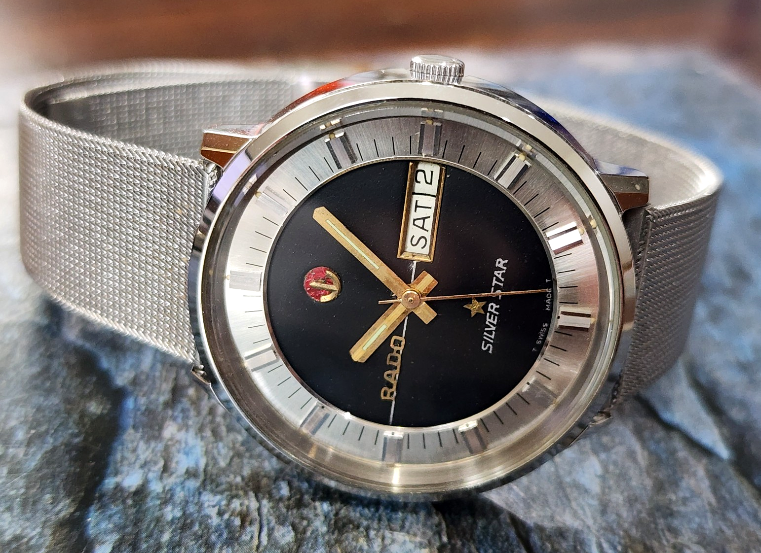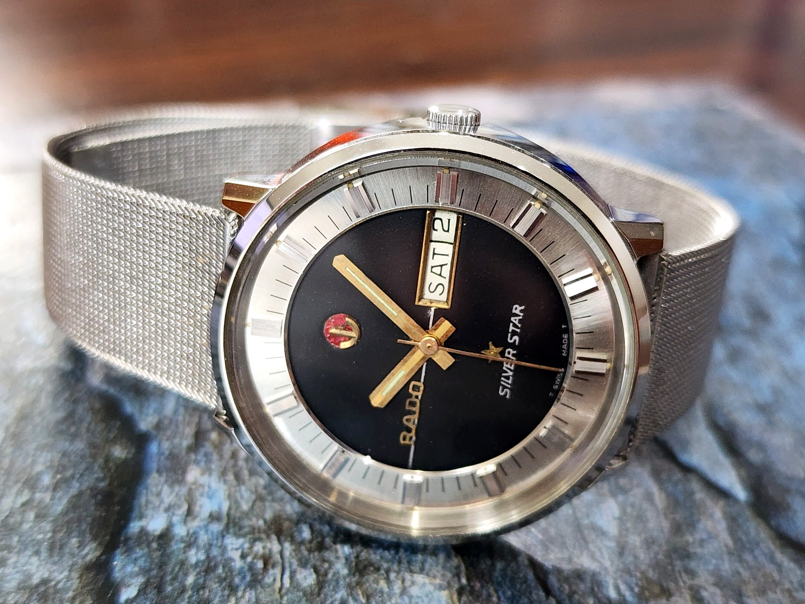 ATTENTION AMERICAN CUSTOMERS: Due to uncertainties with regards to the removal of the de minimis exemption on August 29th we will ONLY be sending via DHL Worldwide Express to the United States. Postal service is currently NOT available as many countries have ceased sending to the United States. Please note that new tariffs and duties will be in effect on the arrival of the package and your purchase will require additional payments to USCBP. As there is no stated policy on how these duties will be assigned or collected we strongly encourage America buyers to contact relevant authorities an/or DHL for clarification. We greatly apologize for this and we do hope things will change in the coming weeks. We invite you to message us if you have any questions. You are bidding on RARE VINTAGE RADO SILVER STAR WRISTWATCH 1970'S. (IT CAN ALSO BE WOUND MANUALLY AS WELL AS BEING AUTOMATIC). DAY DATE is at 3 o’clock Quick SETTING. BLACK DIAL. Mineral glass crystal without deep scratch. Dimension: 37 mm (without crown). Case: Stainless Steel . S/S Back Crown original. bracelet not original unsigned. A RARE CATCH & Highly Collectibles. Pictures describe thousand words.. THIS IS A VERY HANDSOME AND A RARE COLLECTABLE THAT IS READY TO WEAR. CHECK OUT MY OTHER AUCTIONS FOR SOME STUNNING WATCHES,PLEASE LET ME KNOW IF U HAVE ANY QUESTIONS,GOOD LUCK. please keep in mind that vintage watches do not always have the timekeeping accuracy of their modern quartz . International Buyers – Please Note: Import duties, taxes, and charges are not included in the item price or shipping cost. These charges are the buyer's responsibility. Please check with your country's customs office to determine what these additional costs will be prior to bidding or buying. As this is a vintage watch, we do not recommend exposure to water or liquids. thank you.