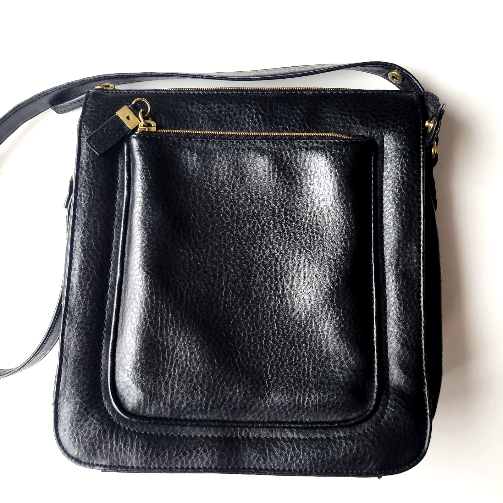 A sleek, practical everyday bag, the RELIC Black Pebbled Faux Leather Zip‑Top Shoulder Purse blends durability with a clean, modern look. Pebbled faux leather exterior for a textured, stylish finish that mimics genuine leather Adjustable strap for a comfortable, customizable fit during daily wear Zip‑top closure to keep essentials secure and easily accessible Multiple pockets — often including front zipper pockets, inner compartments, and an interior zip pocket for organized storage. Open exterior pocket and zip exterior pocket. Interior has 3 sections and one large zippered compartment. Also one small zippered pocket. Lightweight and versatile design suitable for casual outings, errands, or travel Around 9 1/4 inches wide Approximately 10 inches tall Depth of 3.5 inches Adjustable strap with gold hardware.