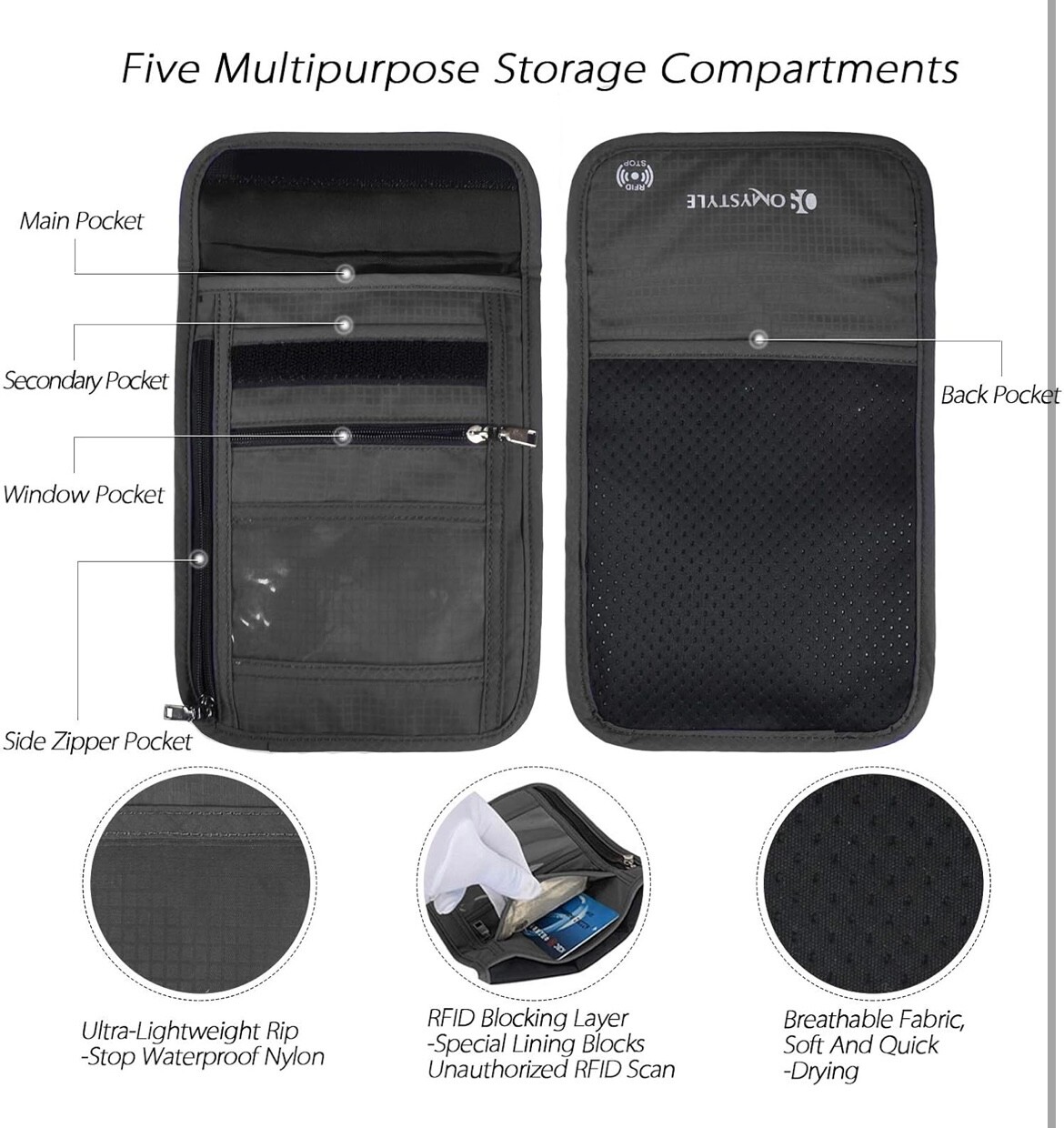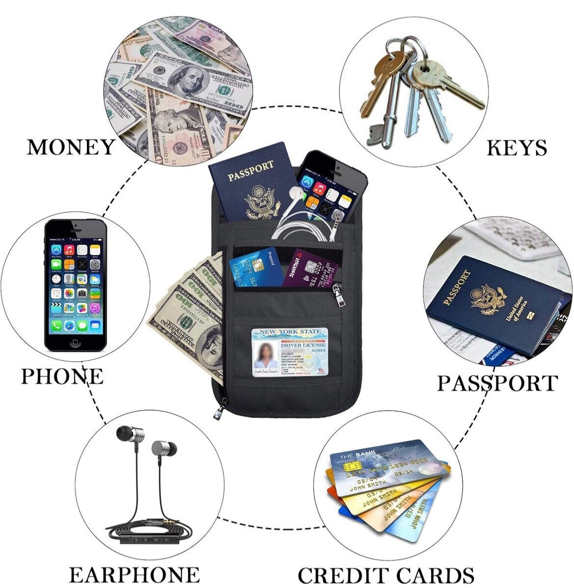 About this item Premium Quality: The travel neck pouch is made of 210D rip-stop nylon, which is water-resistant and tear-resistant. The moisture-wicking mesh backing is breathable and anti-odor. Reinforced stitches and double-release buckles ensure long-lasting use Multipurpose Storage: This passport holder for travel features five compartments to organize your valuables, including two zippered pockets, two Velcro-closure patches, and an ID window for easy access during security checks RFID Blocking Tech: The RFID neck travel wallet is lined with radio frequency shielding material that blocks unwanted scans, securing your cards and private information from electronic theft Convenient Carrying: Our neck travel wallet comes with an adjustable hook, strap, and loop fastener, allowing you to wear it around the neck, waist, or underneath clothing for secure and comfortable carry Slim and Lightweight: This Passport Pouch is ultra lightweight and will not add unnecessary bulk when hanging on neck or putting it into bags. You can enjoy unlimited security, comfort and convenience with this passport wallet