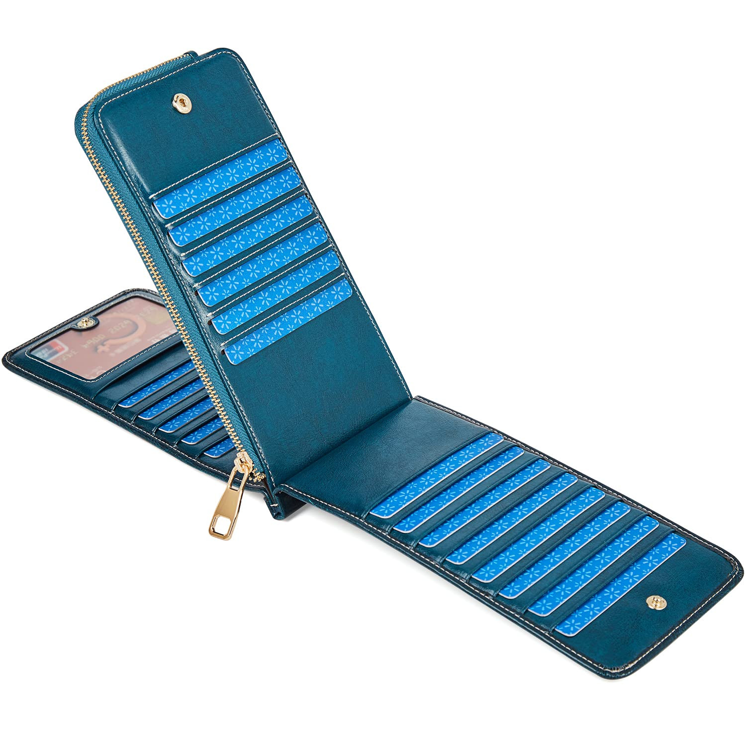 [Durable Material] - This credt card wallet for women is made of quality split leather, enhancing softness and comfort. Polyester lining is silky and it will not scratch your personal belongings. This wallet highlights your feminine elegance and always keep its shape. [Slim but Large Capacity] - Fashion thin design makes the credit card holder look elegant and vintage. Inside with 25 card slots, 1 ID window, 1 zipper pocket can be fit for iPhone X/12/13 Pro Max or other smartphones, passport, cash, etc. Dimension Approx. L 7.8 x W 3.9 x H 1.2 inch (20 x 10 x 3cm), Weight: 0.35lb (0.16kg). Perfect size to be held in your hand or fit in your handbag. [RFID Secure] - Block RFID readers from scanning your credit cards, debit cards, banking information, smart cards, RFID driver's licenses and other RFID Cards. Using this RFID credit card holder you can keep peace of mind while traveling on vacation and surrounded by strangers in airports, crowded streets, and shopping. [Features] - 2 snap buttons design allows you to open or close your wallet smoothly while keeping your cards safe, the zipper pocket can organize your phone/cash better and easily in and out. The metal fox logo in the middle highlights your feminine elegance. Our multi credit card wallet for women features stylish color design, classic and graceful. [Great Gift] - Our card organizer wallet are perfect for casual use /working /dating /party /wedding /travel /business. With Gift Box Packaging so it is a wonderful present for Women’s Birthday, Valentine's Day, Mother's Day, Wedding Anniversary, Thanksgiving, Christmas, etc.