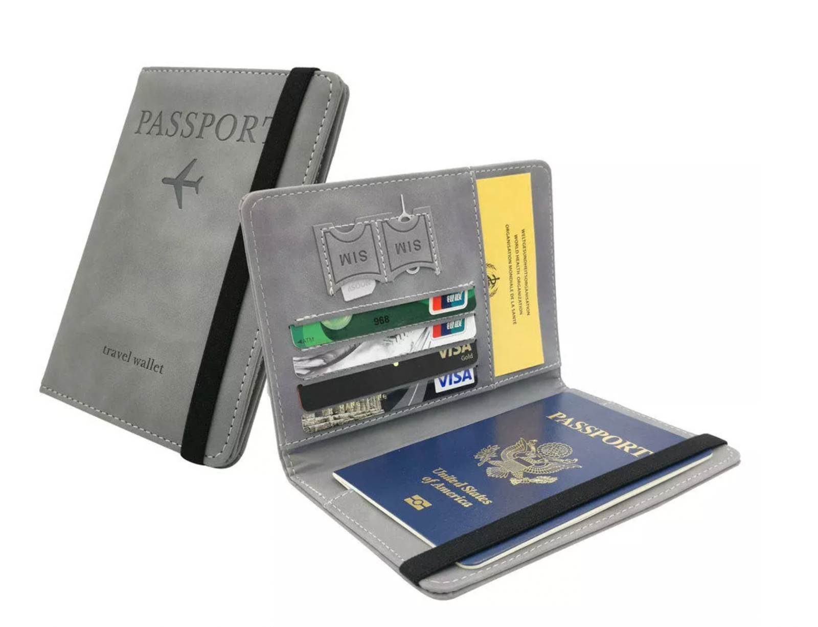 HIGH QUALITY: Faux Leather lining AVAILABLE: d SECURE: RFID blocking shield material inside, this RFID Blocking Holder helps prevent personal account information disclosure. DESIGN: Comes with an elastic strap which can secure items inside, passport cover will not open in your bag. - Elastic band closure - 5x Card Slots - 2x Sim Card Slots - 1x Passport Slot SIZE: 4.2x5.6 inches