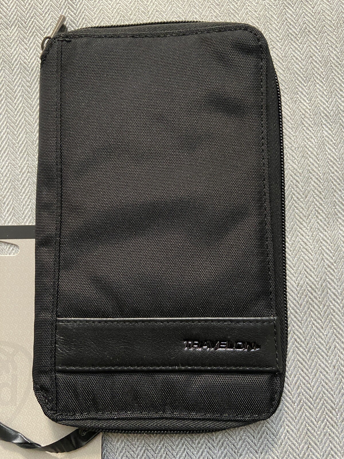 This Travelon wallet is new in package! Color: Black Size: 5" x 8.125" × 0.75" Material: Polyester & Leather Weight (Ibs): 0.27 Help protect your identity with this innovative RFID-blocking card case. Many new credit cards include an RFID or radio frequency identification chip that broadcasts your personal data using radio frequency; vour sensitive information can be captured without your knowledge by an RFID-reading device. This durable multi-passport holder effectively blocks RFID-reading devices to help keep you your families personal data safe. •Thin profile for easy, discrete carrying • Effectively blocks RFID readers from capturing information • Holds up to 6 passports-perfect for family travel • Has 4 card slots •1 pen loop •Slash and zippered pockets