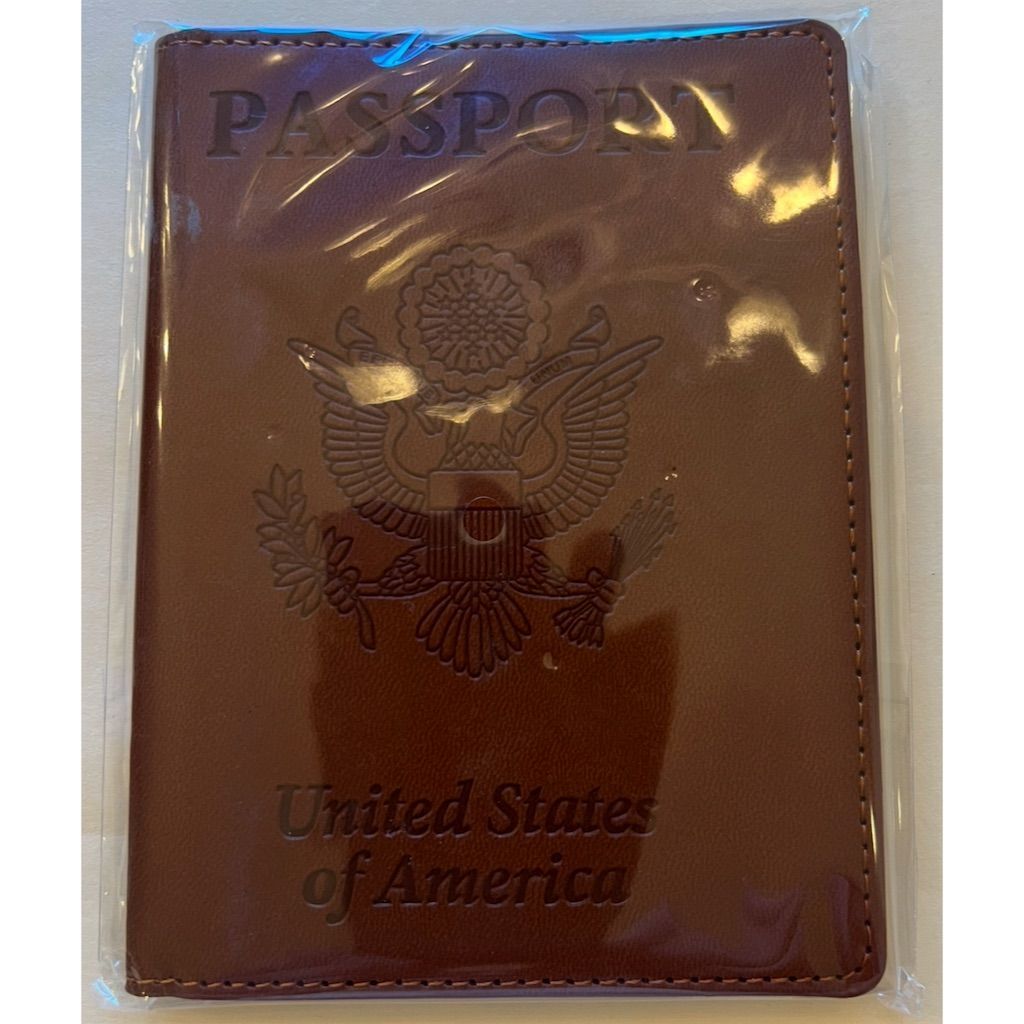 This USA brand leather passport holder is crafted from 100% genuine leather in a rich brown color. It features RFID protection for security and now includes a clear window. Suitable for both casual and formal occasions, the item is new with tags. Keywords: USA brand, leather passport holder, RFID protection, clear window, genuine leather, rich brown, new with tags, casual, formal, secure.