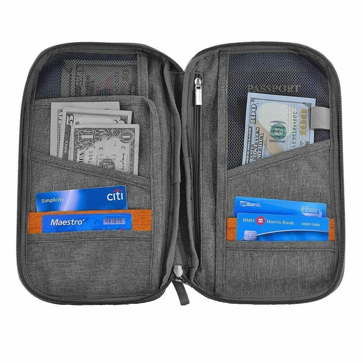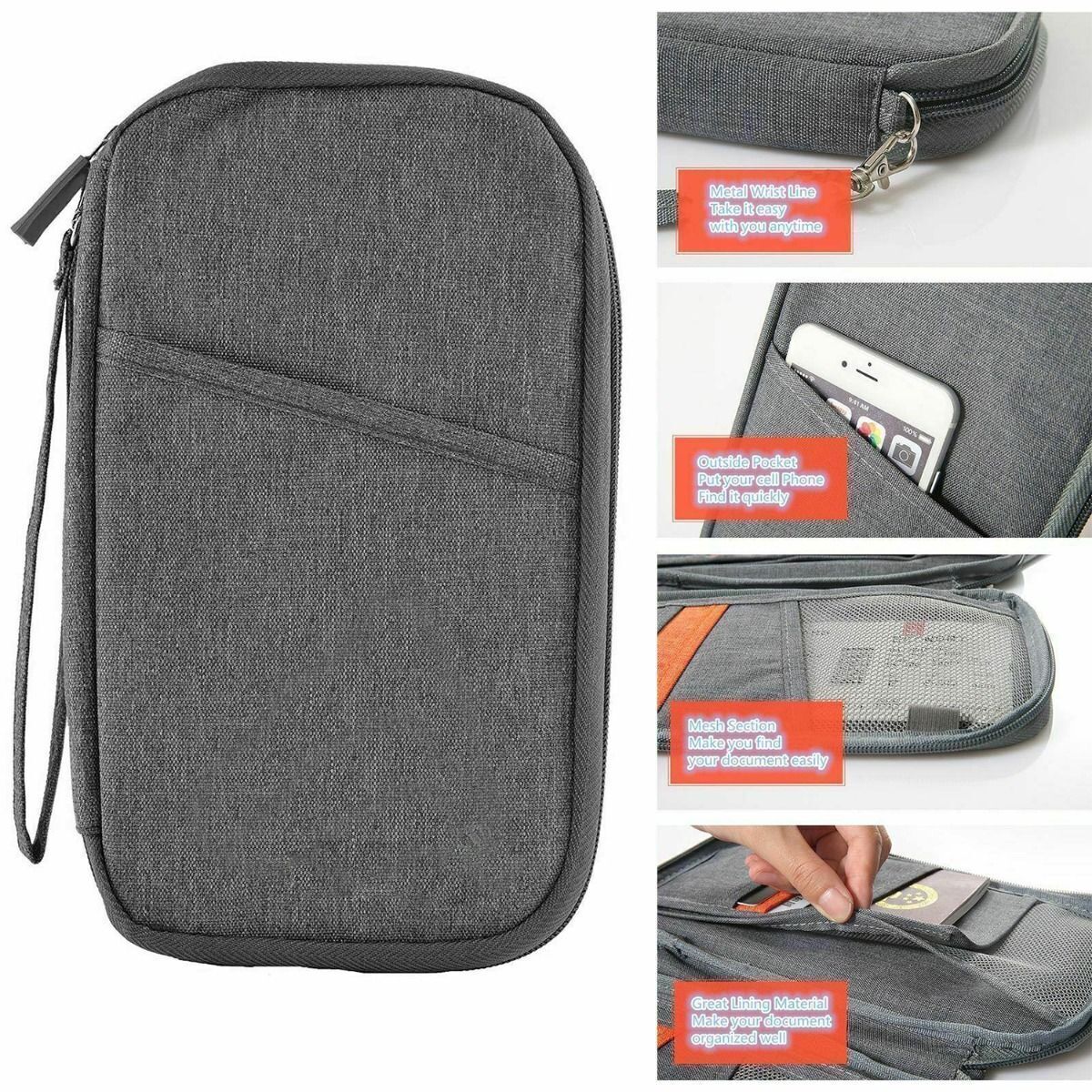 Description: This passport wallet holder has a function of RFID protection, which will prevent your private information from being scanned. Keeping your valuables and documents in a safe circumstance. There is a front pocket for your tickets and other small items. A main pocket for placing your passport, air ticket and cash. 6 pocket slots and one mesh pocket for storing your cards, coins, keys, USB cables, etc. And there is a stylus pen loop for keeping your pen. Made of high-quality Oxford Cloth, the RFID blocking passport wallet holder can against splashing. Have no need to worry your items being wet. A pocket on the front of the passport holder wallet for cell phones, passport, tickets, etc. The pocket is 3.9inch(10cm) wide. It's big enough to compatible with iPhone XS MAX cellphones or others. It?s a convenient passport cover wallet for men and women. Good choice for travel, study, office and more. DIMENSION: 7.2 * 4.84 * 0.78 inches (18.5 * 12.3 * 2 cm); Weight - 4.19 oz (119 g). It is lightweight and portable. Hold pens up to 15cm in length. Features: Type: Travel Passport Bag Color: Grey Closure Type: Zipper Item Dimensions: 18.3 x 12.3 x 2Cm Material: Oxford cloth Passport Pockets: 2 Card Slots Pockat: 4 Hidden Pockets: 2 Large Open Pocket: 1 Mesh Zipper Pocket: 1 Package Includes: 1 X Travel Wallet Passport Holder