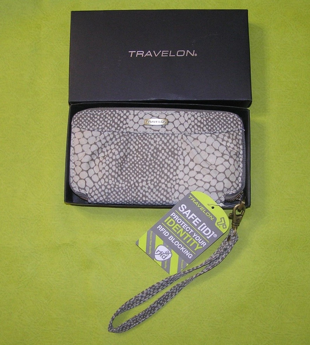 Travelon Zip Wristlet Wallet Travel Organizer Cell Bag New with Box ***Features RFID Blocking to protect your credit/bank card info*** Don't let thieves steal your credit or bank card information through scanning! RFID technology helps prevent thieves from stealing your info. Can be worn as a wristlet/clutch or remove the handle and use as a wallet! Zip around closure Multi-Compartment & slots for all your essentials Most smart phones will fit as well. Measures approx 7.5" x 4". Detachable handle strap is approx 8" Color is kinda tan/brown animal design. *Colors may appear different de[pending on your viewing device. Perfect for b-bopping around town or traveling. TRAVELON is a leader in stylish RFID protection accessories. Brand new with tags and gift box. ->Please view all photos as they show the exact authentic TRAVELON Wristlet/Wallet you will receive. Please ask all questions BEFORE buying, No returns accepted. ->Payment within 24 hours please and I will get your TRAVELON item shipped out to you with tracking included.