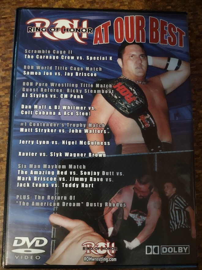 This listing is for the Ring of Honor (ROH) DVD "At Our Best" from March 13, 2004. This is the original print of the DVD with the old ROH logo before the rebrand. Case has minor markings from age but nothing notable. Disc has only very minor light markings and is in good shape. Tested and works. As far as I can tell this show by itself is no longer in print, so the DVD would make a good purchase for a wrestling DVD collector. Keep an eye on my listings if you're interested in wrestling DVDs, as I have a bunch of ROH DVDs to list from 2002-2006 as well as a few from other promotions. Match listing is as follows: Scramble Cage II: The Carnage Crew Vs Special K ROH World Title Cage Match: Samoa Joe Vs Jay Briscoe ROH Pure Title Match: Guest Referee Ricky Steamboat: AJ Styles Vs CM Punk Dan Maff & BJ Whitmer Vs Colt Cabana & Ace Steel #1 Contenders Trophy Match: Matt Stryker Vs John Walters Jerry Lynn Vs Nigel McGuinness Xavier Vs Slyk Wagner Brown Six Man Mayhem Match: Amazing Red Vs Sonjay Dutt Vs Mark Briscoe Vs Jimmy Rave Vs Jack Evans Vs Teddy Hart Plus: The Return of Dusty Rhodes