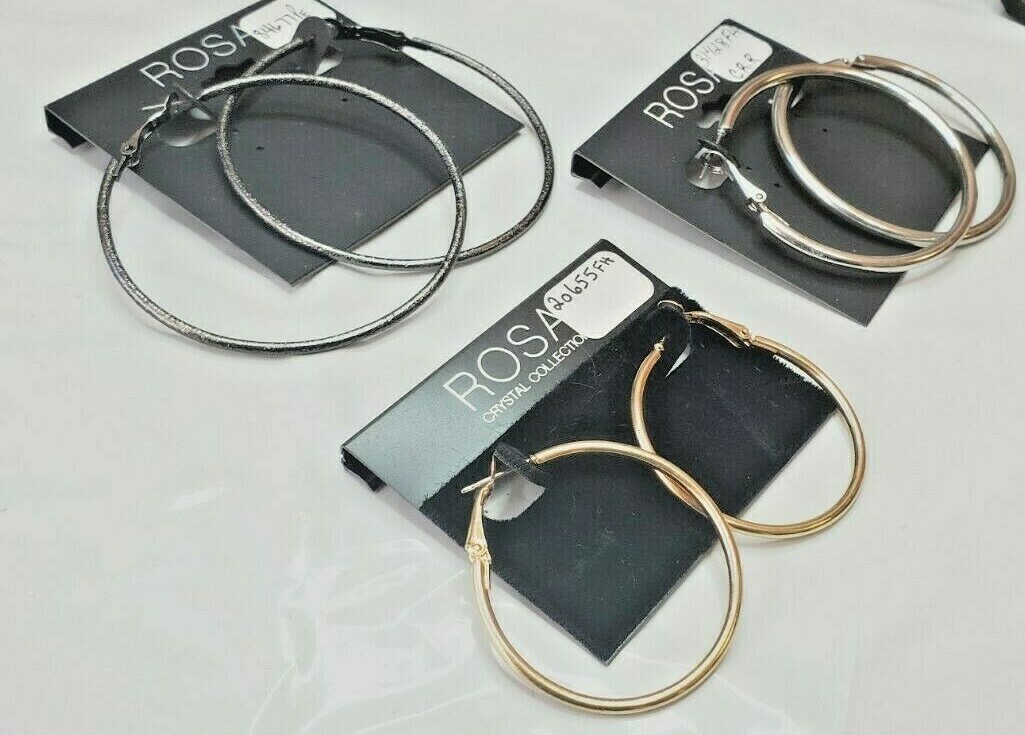 ROSA brand hoop earrings. 3 pair. New. # Pieces In Set: 3 Pair First Pair- Black Metallic - Lever Back, 2.5 inches 2nd Pair- Silver-Lever back- 1.75 inches 3rd Pair- Gold- Lever back - 1.5 inches To clean: wipe with clean cloth Thank You For Shopping With Me! Payment Information Payment is due within 48 hours of auction ending . Shipping Information Most items ship same or next day depending on the time payment is issued. All items will be wrapped very carefully. All items will be shipped with a tracking number. I can combine shipping on multiple auctions. I provide insurance on all items shipped. Please be aware that the delivery time is only an estimate by ebay. Returns I will accept returns. I will accept returns for 30 days after your item has been delivered. If an item is damaged during shipping, I will refund the purchase price after I receive proof it was damaged. I will not accept returns if you just change your mind. Please make sure this is the item you want to purchase. I will not accept a return because you found the item cheaper or found an item you like better. Shipping is too expensive for me to ship back and forth, make sure this is the item you want. If an item is new with tags, it needs to be returned new with the tags still on the item. Feedback I will leave positive feedback as soon as the item is paid for. If for any reason you are not happy with your purchase please email me and I will try my hardest to make you happy . WM-BX-4