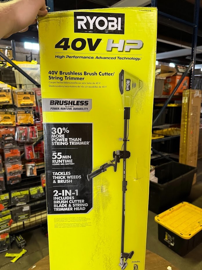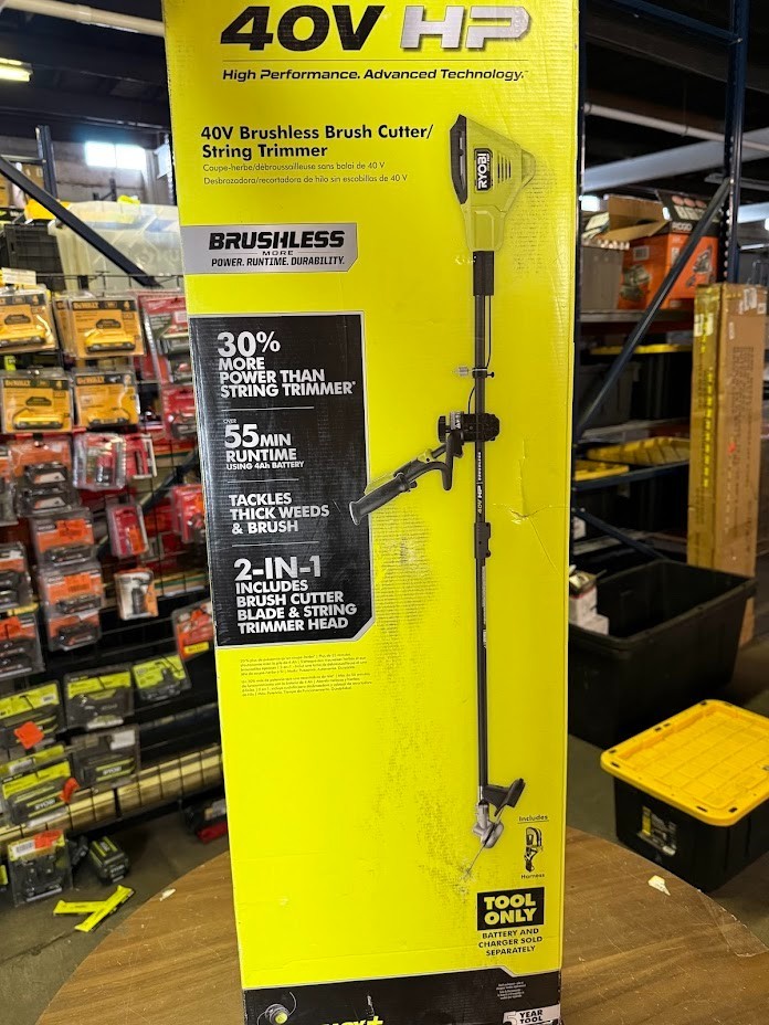 This is a NEW OPEN BOX item. The RYOBI 40V HP Brushless Brush Cutter/String Trimmer is a high-performance, cordless solution engineered to outperform gas-powered tools. Backed by 40V HP technology , this tool combines a powerful brushless motor , advanced electronics, and high-capacity lithium batteries to deliver 30% more power than a standard string trimmer —ideal for cutting through thick brush and stubborn weeds. Achieve up to 55 minutes of runtime with a 40V 4Ah battery (battery and charger sold separately). Featuring a 10" reversible TRI-ARC blade , bike-style handles , and a shoulder harness , this brush cutter is designed for extended use with superior balance, comfort, and control. Switch to the included REEL EASY+ bump-feed string trimmer head to tackle lighter trimming tasks with a 15" cutting swath. With variable speed control , 2-speed settings , and tool-free adjustable handles , this unit is both powerful and versatile. Part of the RYOBI 40V System , it's compatible with all RYOBI 40V batteries. Highlights 40V HP Technology : Brushless motor, intelligent electronics, and lithium battery deliver high power and durability Gas-Replacement Power : 30% more power than a string trimmer, designed to handle thick brush and heavy overgrowth Runtime : Up to 55 minutes with 40V 4Ah battery; up to 88 minutes with 6Ah battery (battery not included) Dual Cutting Options : 10" TRI-ARC reversible brush cutter blade for dense brush 15" string trimmer head for lighter trimming tasks Comfort-Focused Design : Bike-style handlebar design for ergonomic handling Harness included for improved weight distribution REEL EASY+ Bump-Feed Head : Reloads .095" line in under 60 seconds Variable Speed Trigger & 2-Speed Settings : Choose more power or longer runtime Folding Handle Design : For compact storage Part of the RYOBI 40V System : Works with all RYOBI 40V batteries and tools We take great care to inspect all items and ensure they are accurately described. Should you have any issues with your purchase, please let us know immediately. We are committed to resolving any concerns promptly and to your satisfaction. Our small business truly appreciates your patronage.