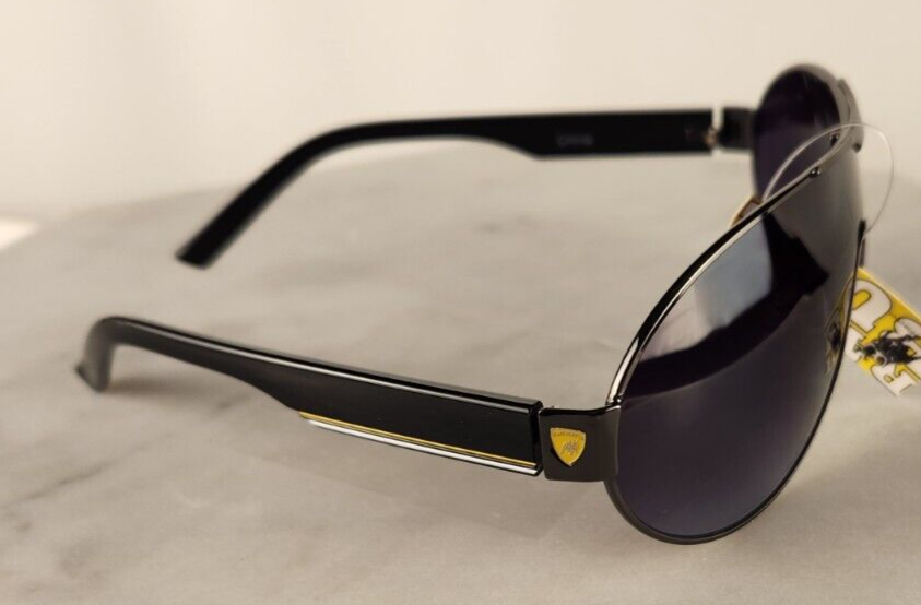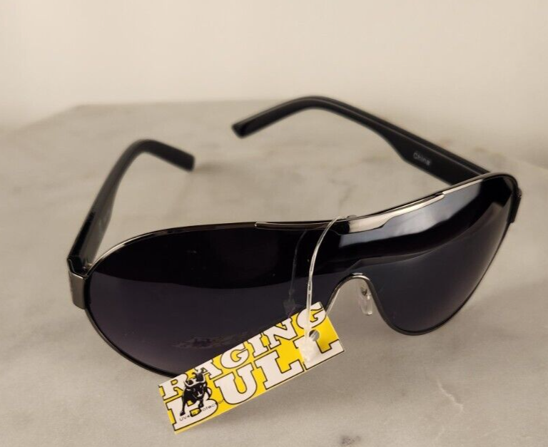 This is an authentic pair of Raging Bull sunglasses with a black frame and a single, oversized lavender lens and yellowlogo. The sunglasses offer UV400 protection and have a wrap style that is perfect for fans of movies, bikers, motorcycle riders, rock and roll, and trendy fashion. The temple length is 130mm. These sunglasses are unisex and suitable for adults. If you're looking for a fun and unique pair of sunglasses, these are the perfect choice.